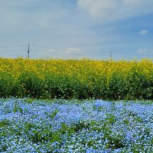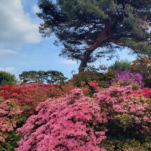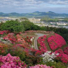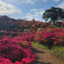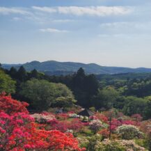 This photo was taken at Chosenji Temple (Honjo City), with depth in mind, of beautiful wisteria flowers blooming above pure white azaleas.
