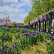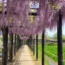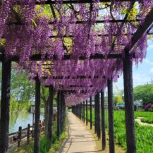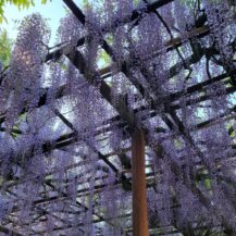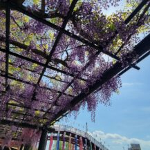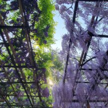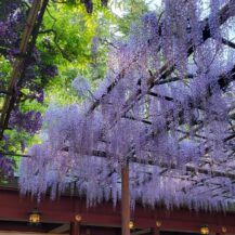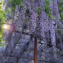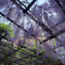 This photo was taken at Kasama Inari Shrine, looking up at the moment when a slight light started to shine on the wisteria flowers in full bloom.