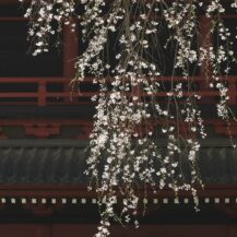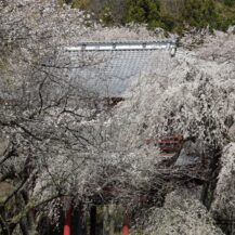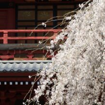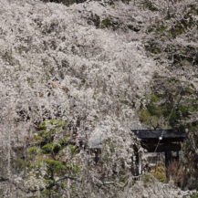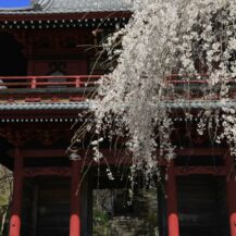 撮影のポイントは、枝垂れ桜の“流れるライン”と門の“直線的な構造”を対比させる構図を作ることです。曲線と直線の組み合わせを意識することで、写真にメリハリと美しさが生まれます。また、門の下から見上げる構図では、枝垂れ桜が空を覆うような迫力を表現でき、逆に少し距離を取って撮影すると、門と桜のバランスが整った落ち着いた印象の写真になります。