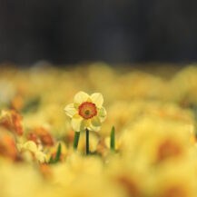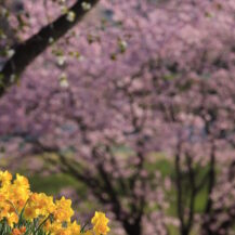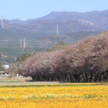 撮影のポイントは、手前の水仙を主役にしながら、奥の桜をしっかり活かす構図を作ることです。水仙だけ、桜だけではなく、両方をバランスよく配置することで、この場所ならではの魅力が引き立ちます。特にローアングルで水仙にピントを合わせ、背景に桜を入れることで、奥行きと立体感のある一枚になります。逆に少し引いて撮影すると、水仙と桜並木の広がりを強調した、開放感のある写真に仕上がります。