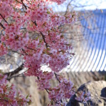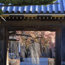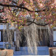 撮影のポイントは、河津桜の花にピントを合わせて背景のお寺をぼかしたり、逆にお寺の建物を主役にして手前の桜をぼかすなど、前景と背景を意識した構図を作ることです。また、木漏れ日が入るタイミングでは玉ボケを活かした柔らかい雰囲気の写真も撮影できます。なお、お寺は参拝の場所でもあるため、撮影の際は参拝者の方の迷惑にならないようマナーを守って静かに楽しむようにしましょう。