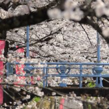 This photo was taken at Minobu-san Kuon-ji Temple to show the weeping cherry trees and the signboard of the police station at the entrance of the temple. It is an interesting contrast of everyday life and spring scenery.