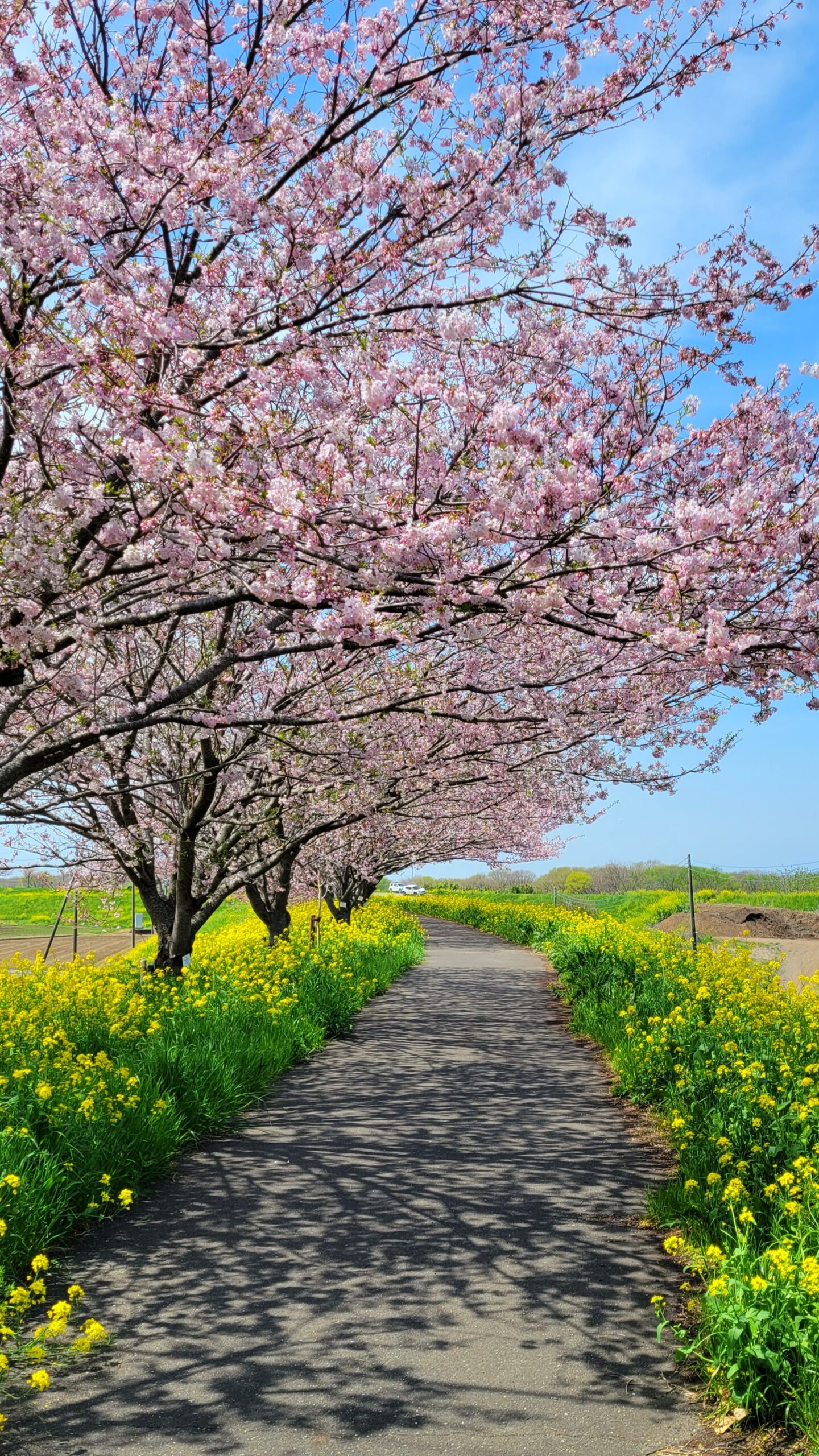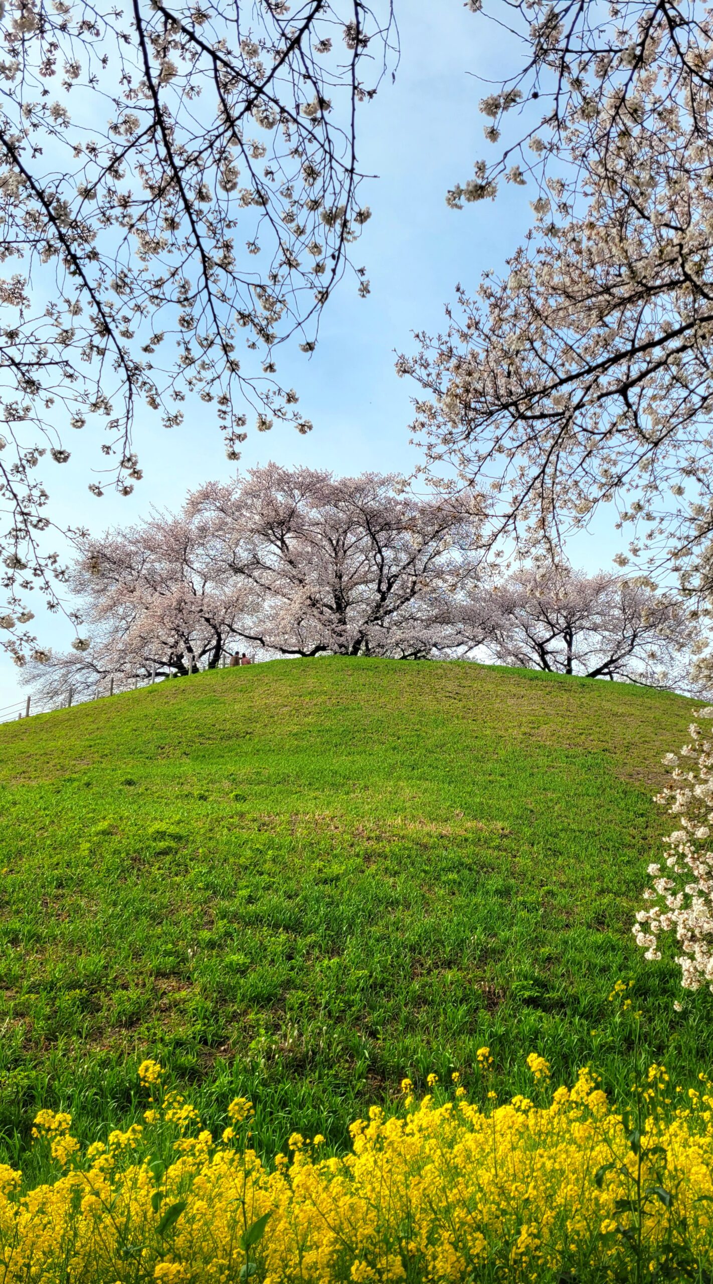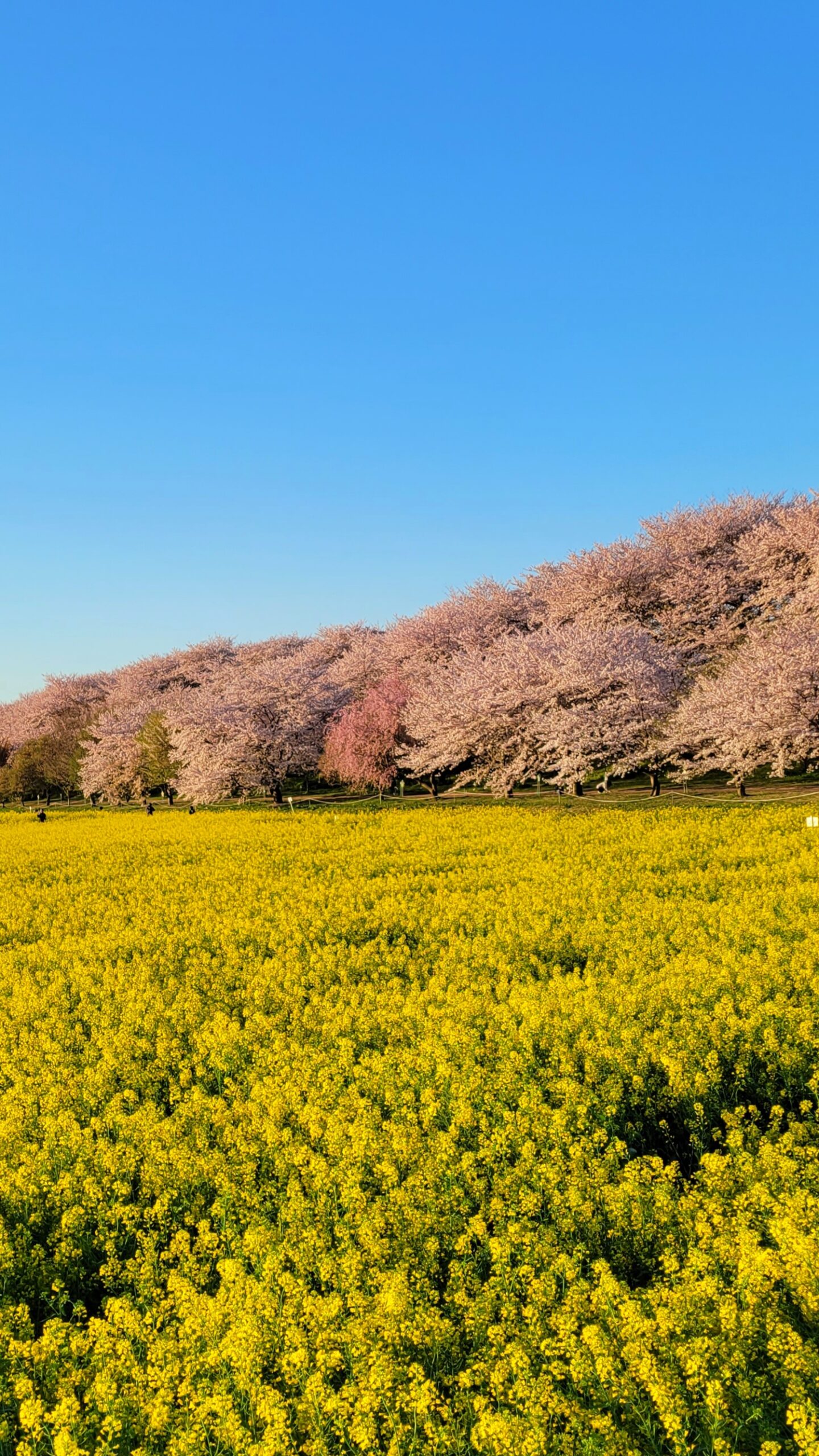 Someiyoshino (Yoshino cherry trees) are famous for their contrast with rape blossoms. The scenery is in full bloom with the spring-like atmosphere.