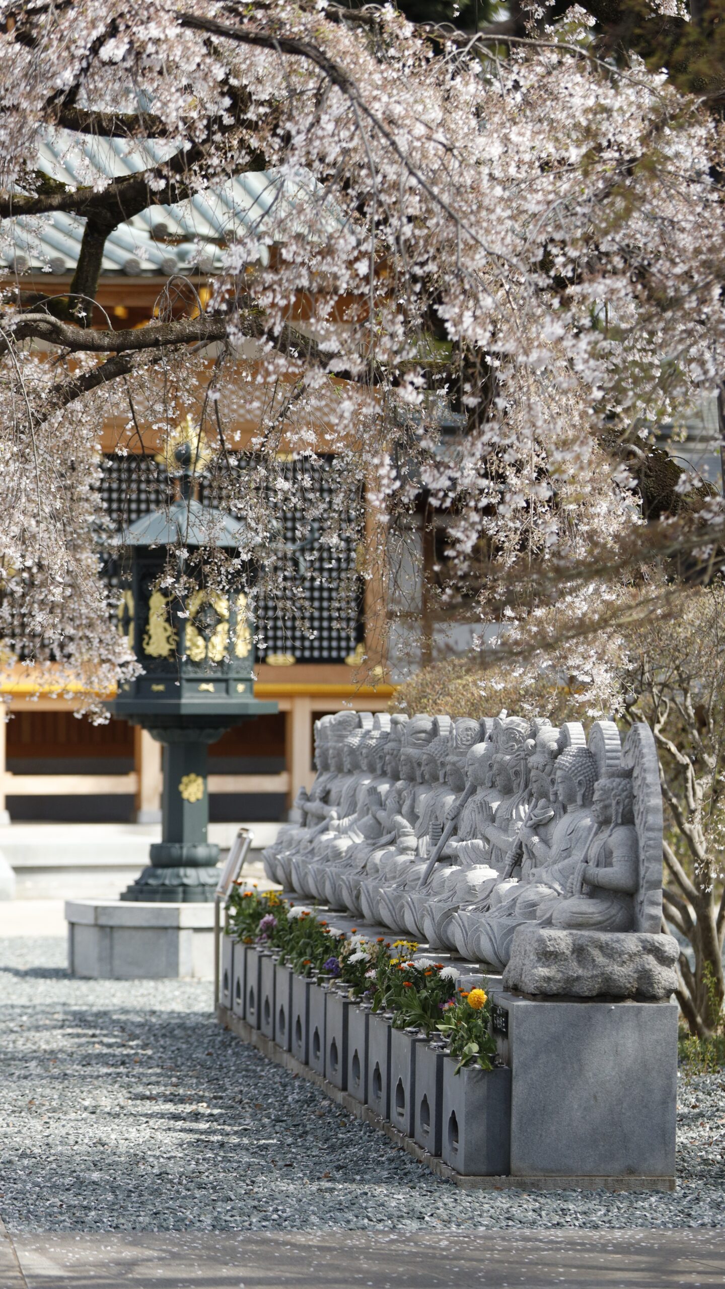 The combination of the historic temple and weeping cherry blossoms is a beautiful sight. Visitors can enjoy spring in a serene atmosphere.
