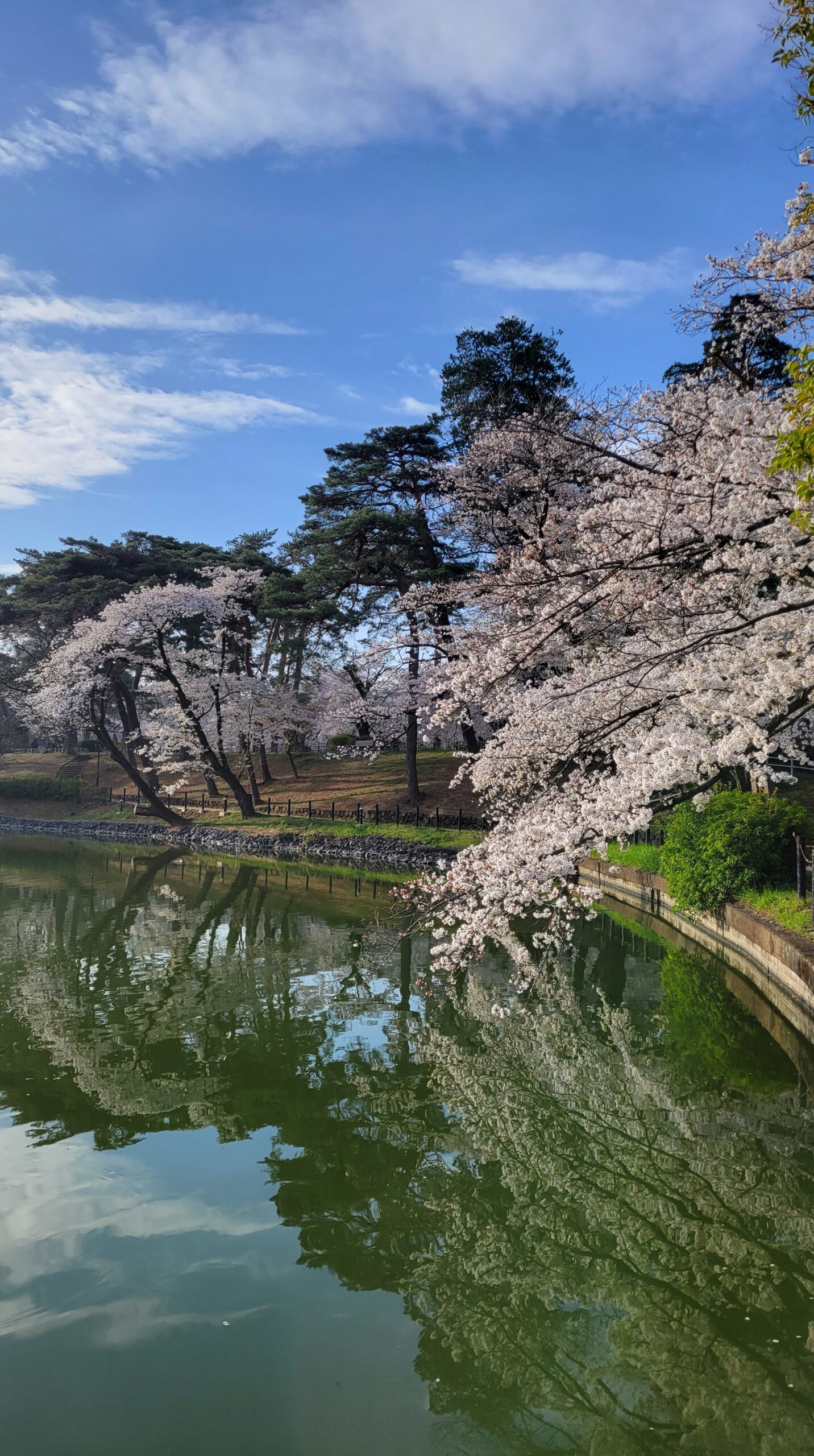 Someiyoshino cherry trees blooming around the pond are attractive. Cherry blossoms reflected in the water create a relaxing spring time.