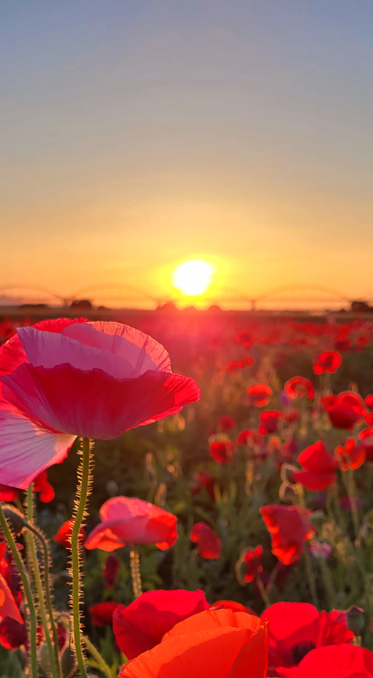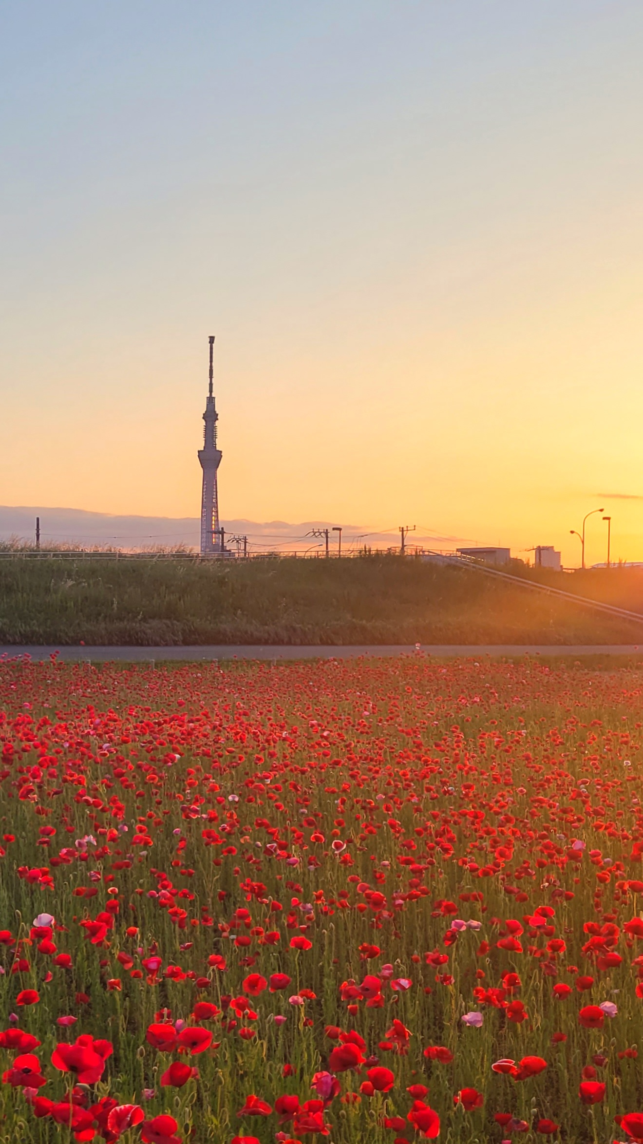 夕日に輝くポピーとスカイツリーが重なる、都会と自然が調和する撮影スポットです。
