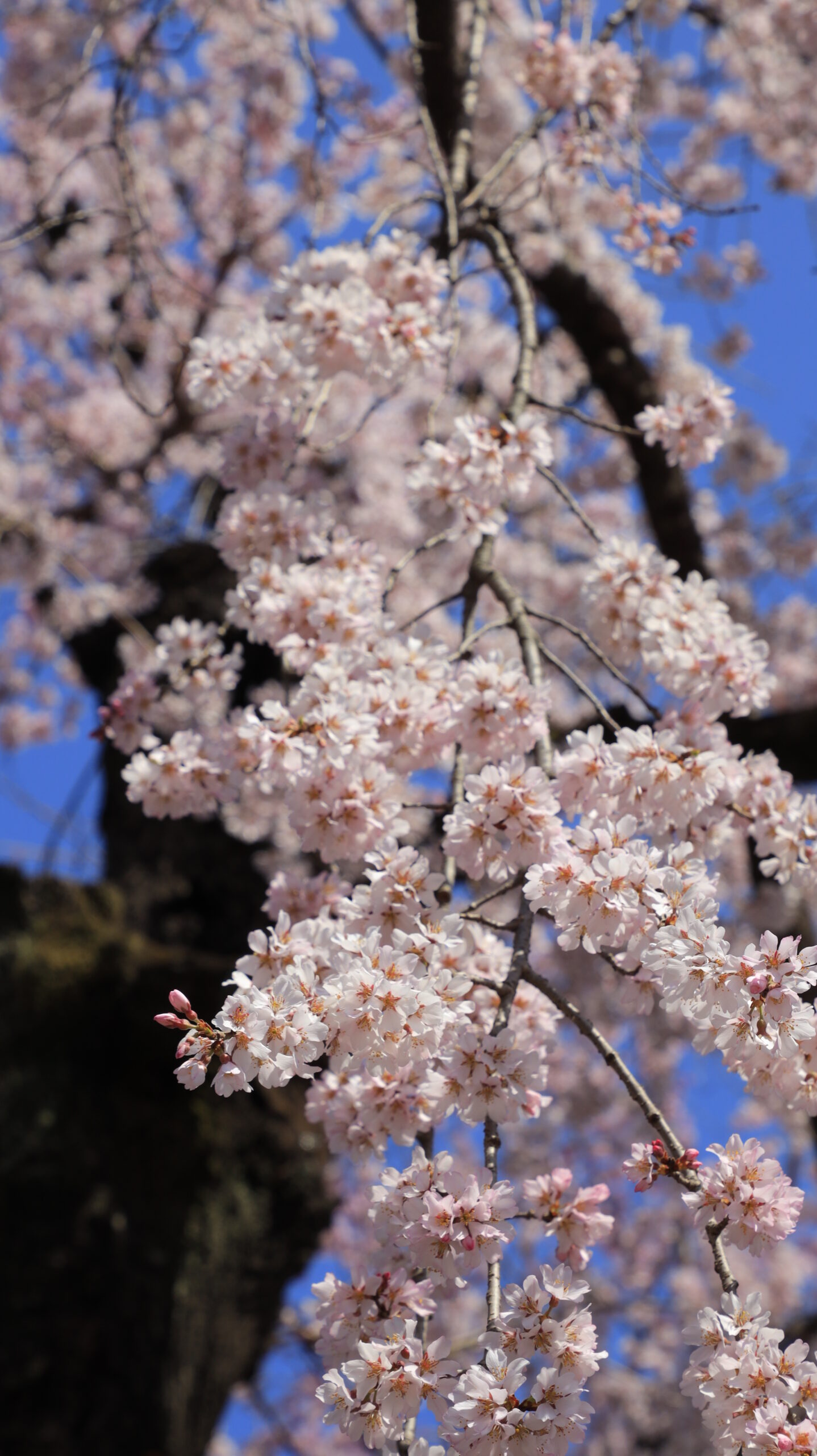 This photo shows weeping cherry trees in a soft atmosphere at Kita-in Temple.