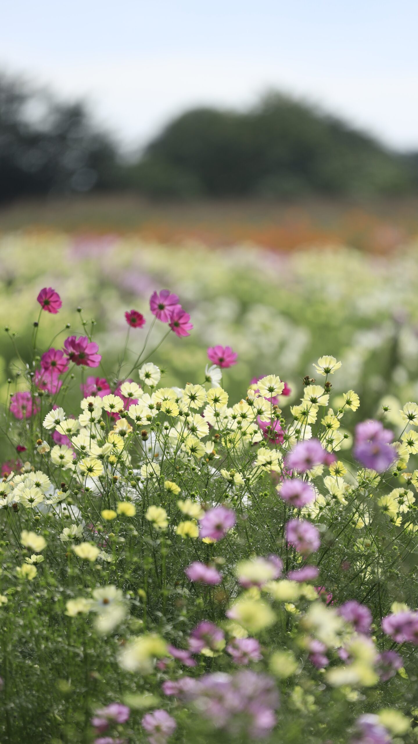 この写真は、コスモスアリーナふきあげで、カラフルなコスモスたちを逆光の中で少し広めに撮影したものです。赤や白、ピンク、黄色の花々が朝の光を受けて輝き、秋の花畑らしい華やかさが広がっています。