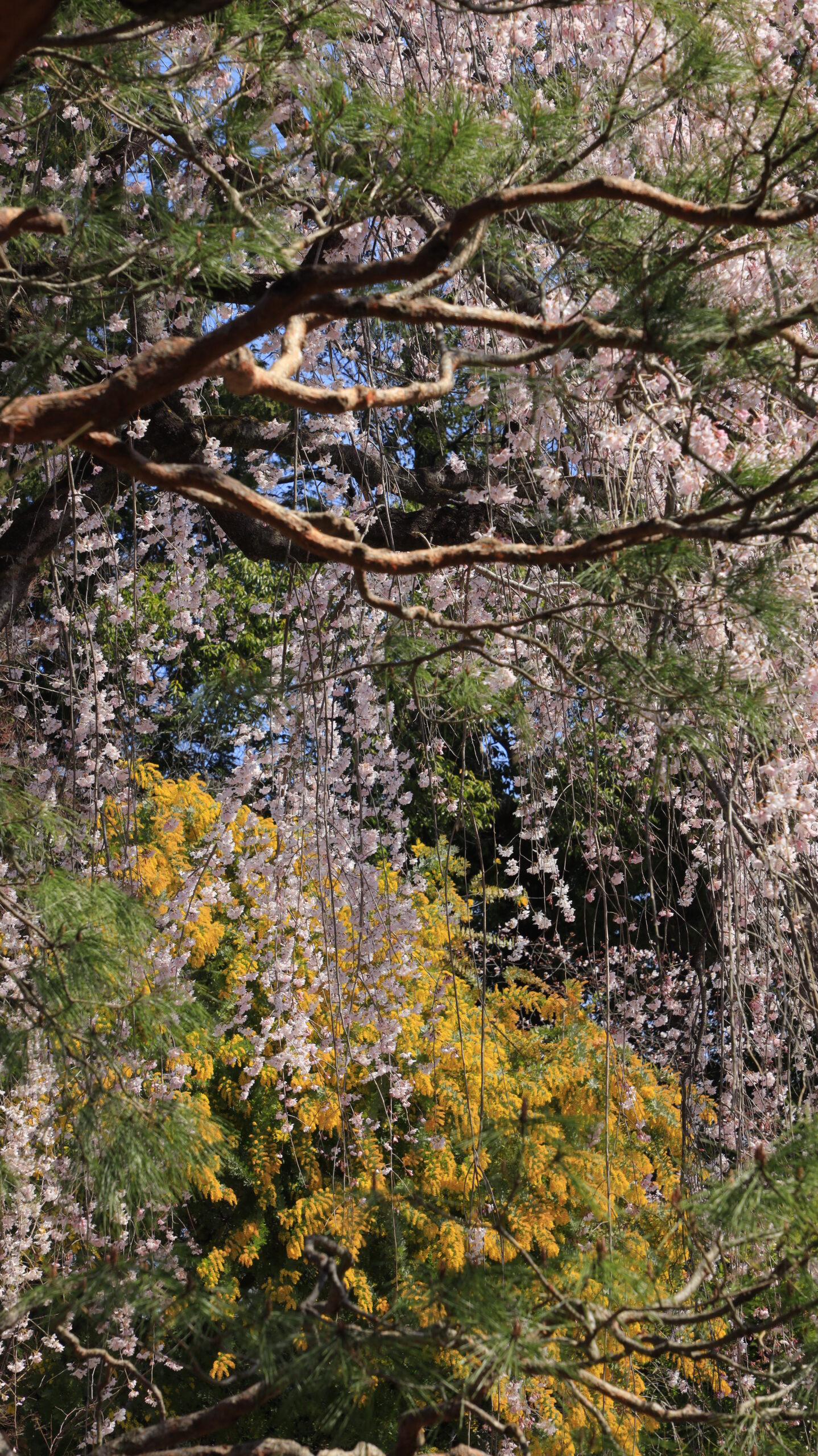 In this photo, the composition of weeping cherry trees, mimosa, and pine trees fold over each other in the central temple to create a three-dimensional effect.