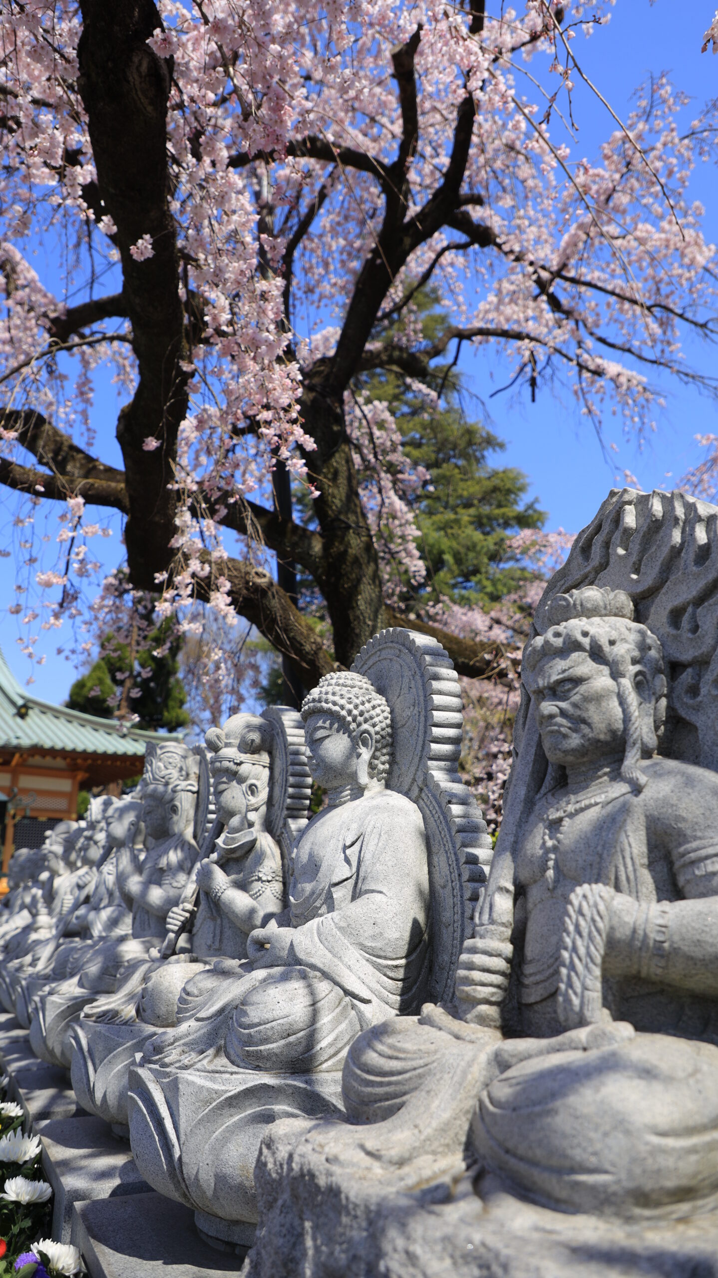 This photo was taken at Hodanji Temple, taking advantage of the composition of the lined Buddhist statues and the cherry blossoms above them.