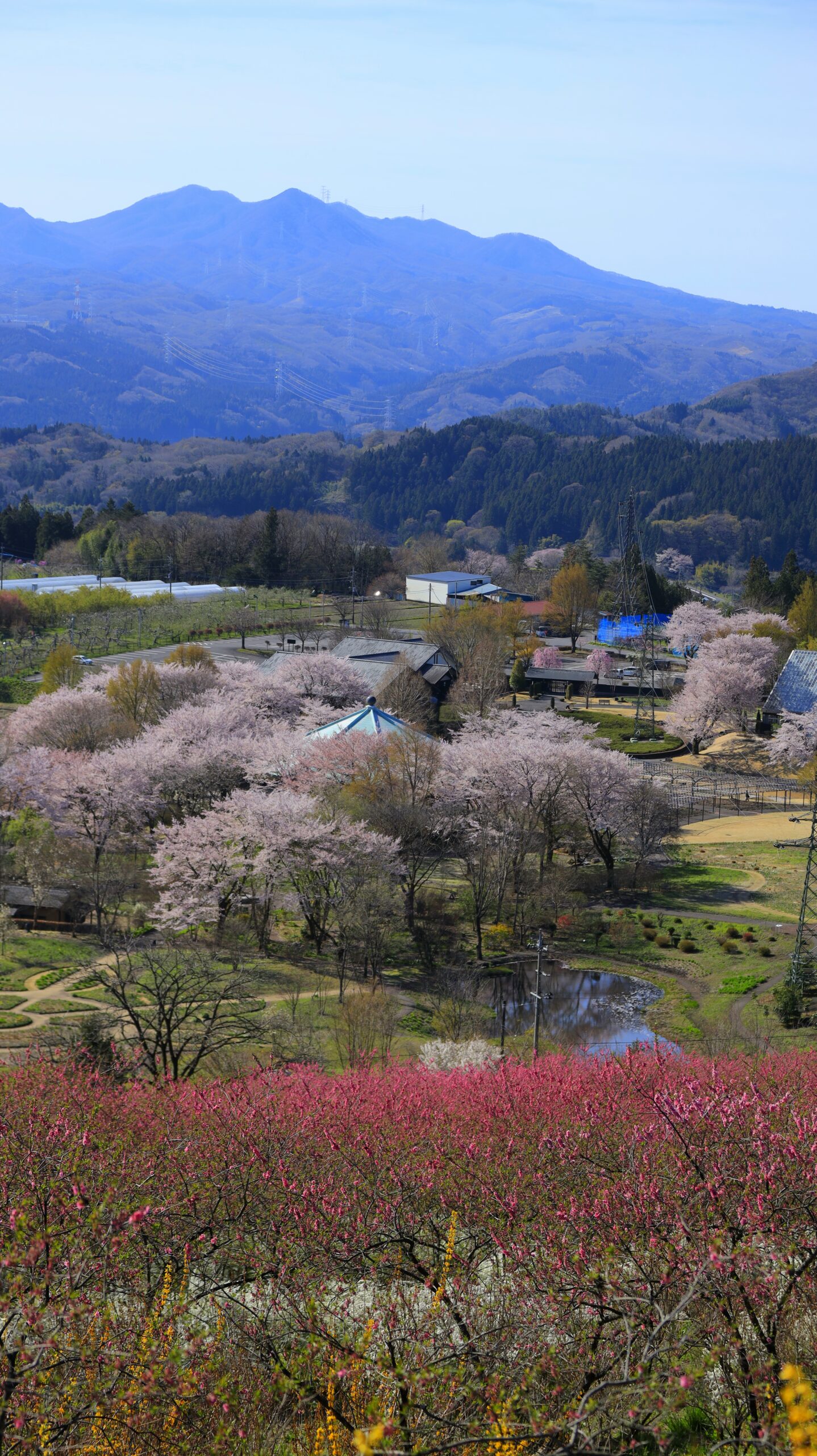 This photo was taken at Hanamomo Hill, looking down from the top of the hill, with an expansive composition of the cherry blossoms at Nakanojo Gardens.