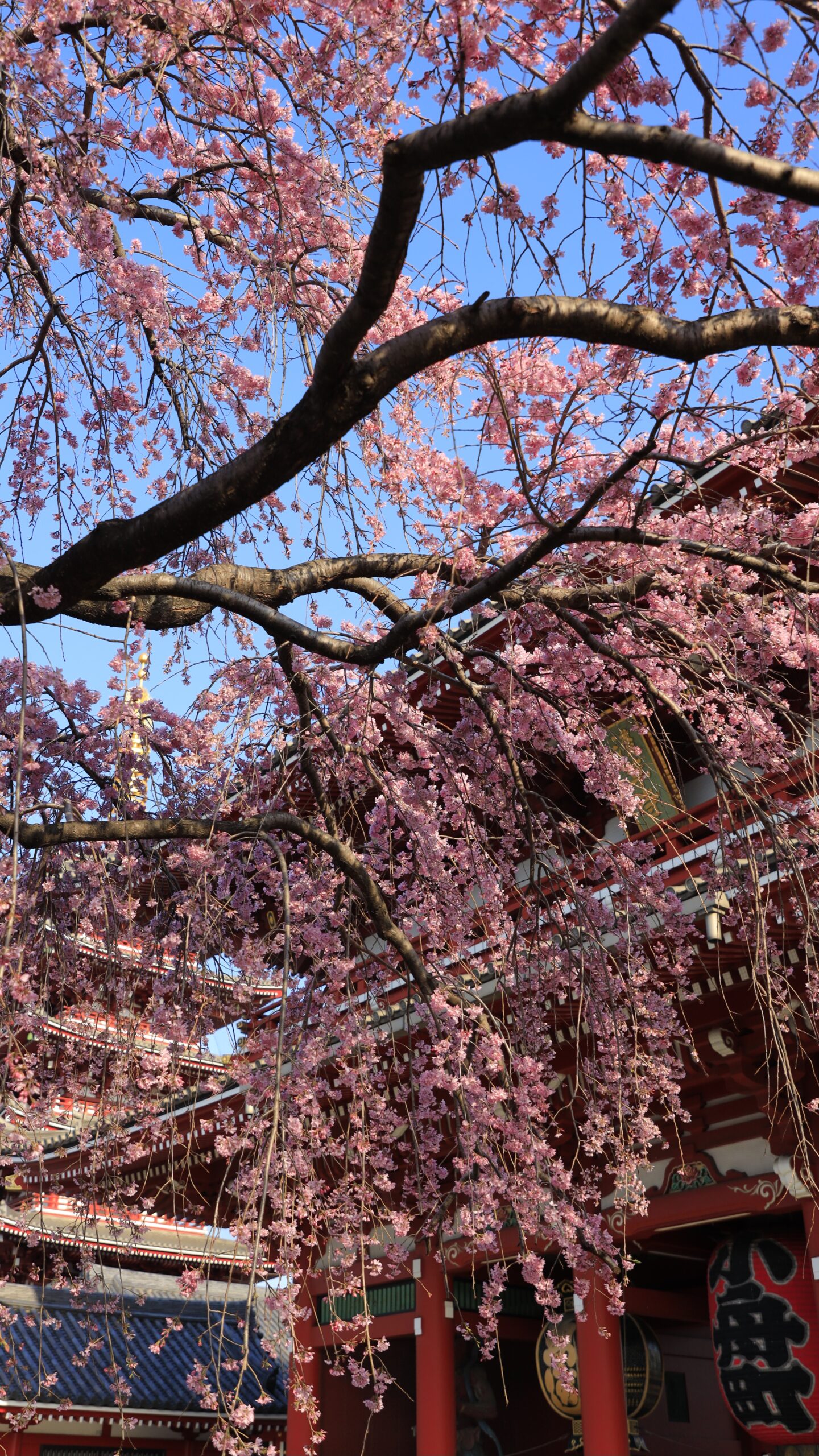 Senso-ji Temple|Gorgeous composition with weeping cherry blossoms in full bloom and the gate and five-story pagoda
