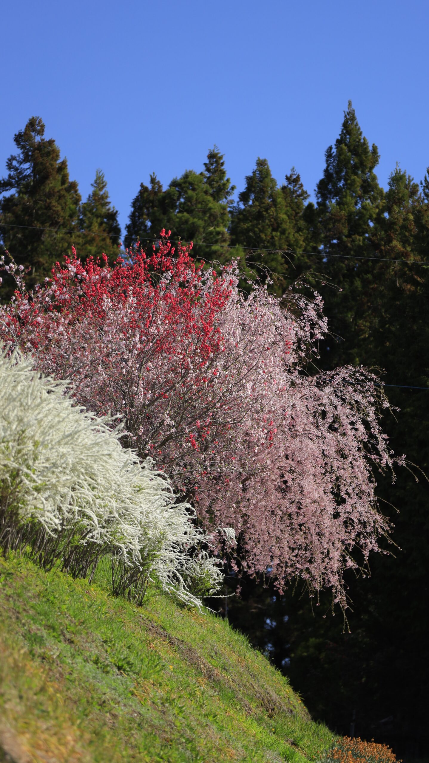 Nakanojo Gardens, Hana-Momo no Oka|Cherry blossoms, peaches, and snow willows overlap