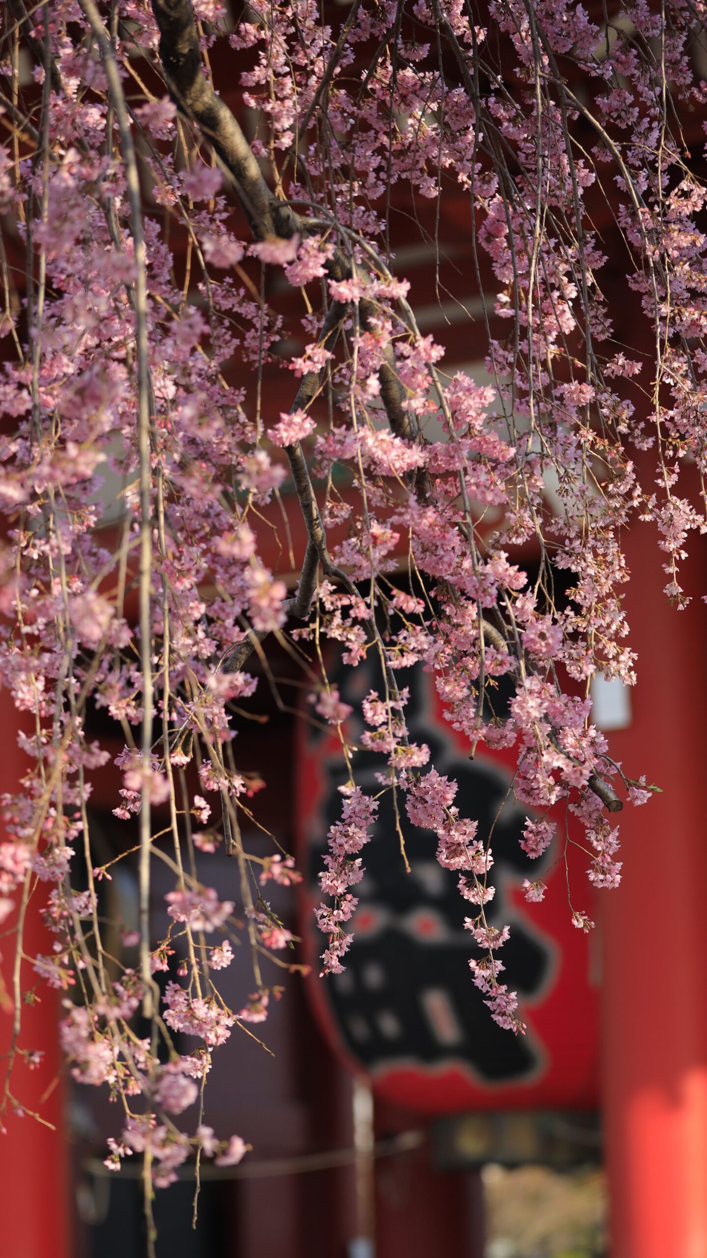 In this photo of Sensoji Temple, the cherry blossoms are in bright focus and the lanterns in the background are blurred to create depth and a soft atmosphere.