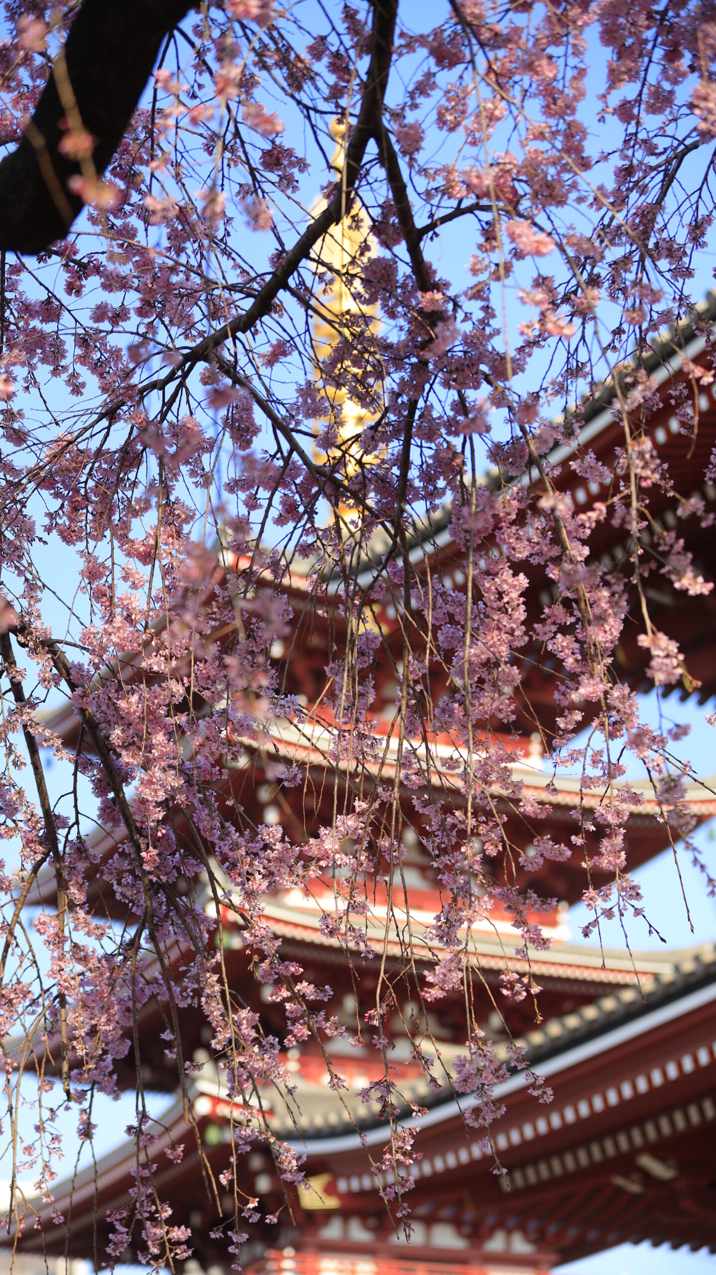 Spring and historical architecture together at Sensoji Temple, with the five-story pagoda captured over weeping cherry blossoms.