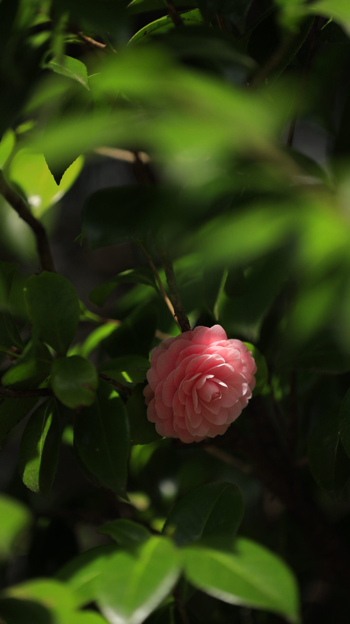 This photo was taken at Rikugien garden, with the camellia blooming at the end of a pathway, with the balance of yin and yang in mind. It gives a sense of stillness and depth.