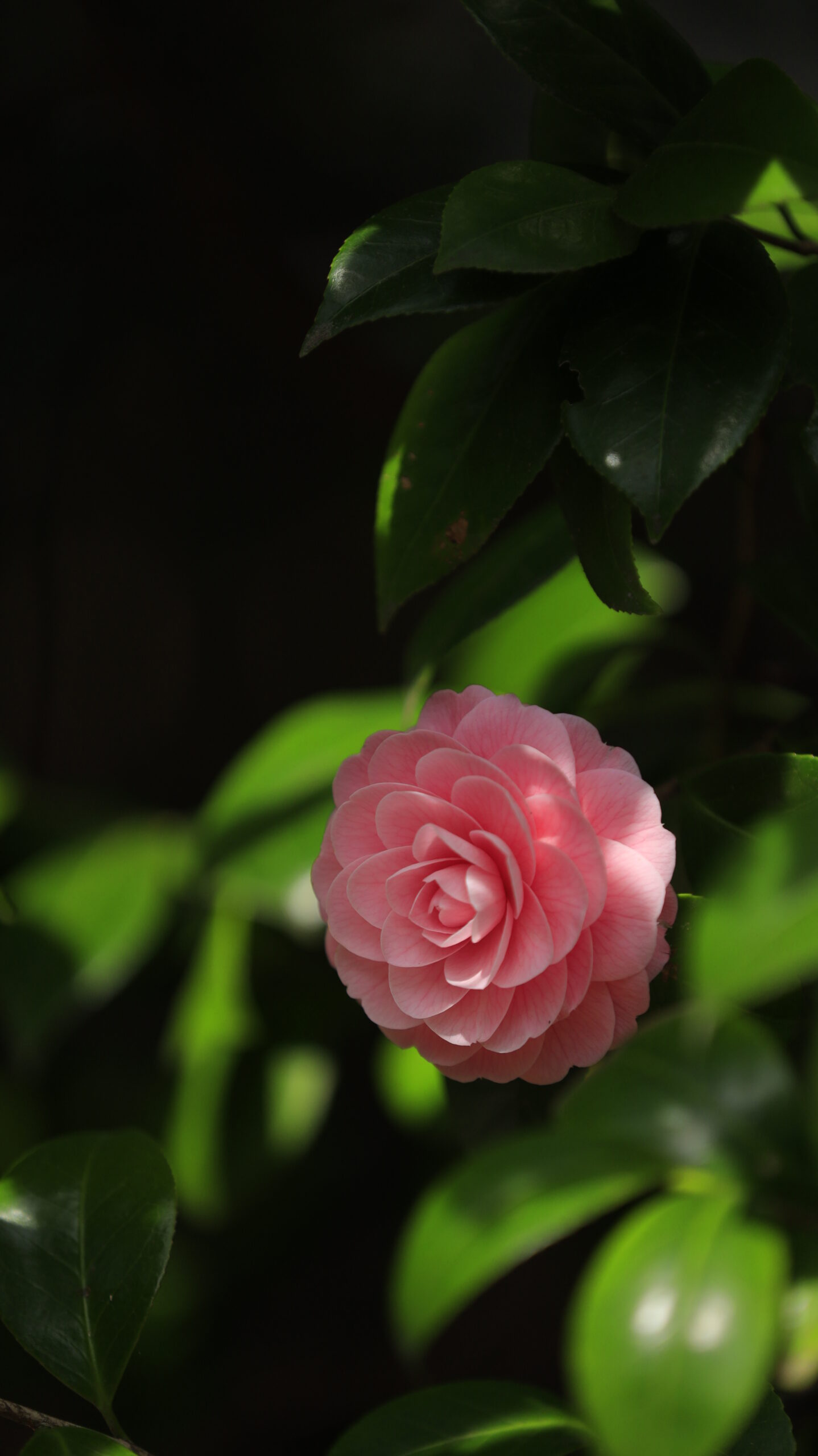 This photograph is a close-up of a camellia blooming along a path in Rikugien, carefully capturing the beauty and texture of the flower.