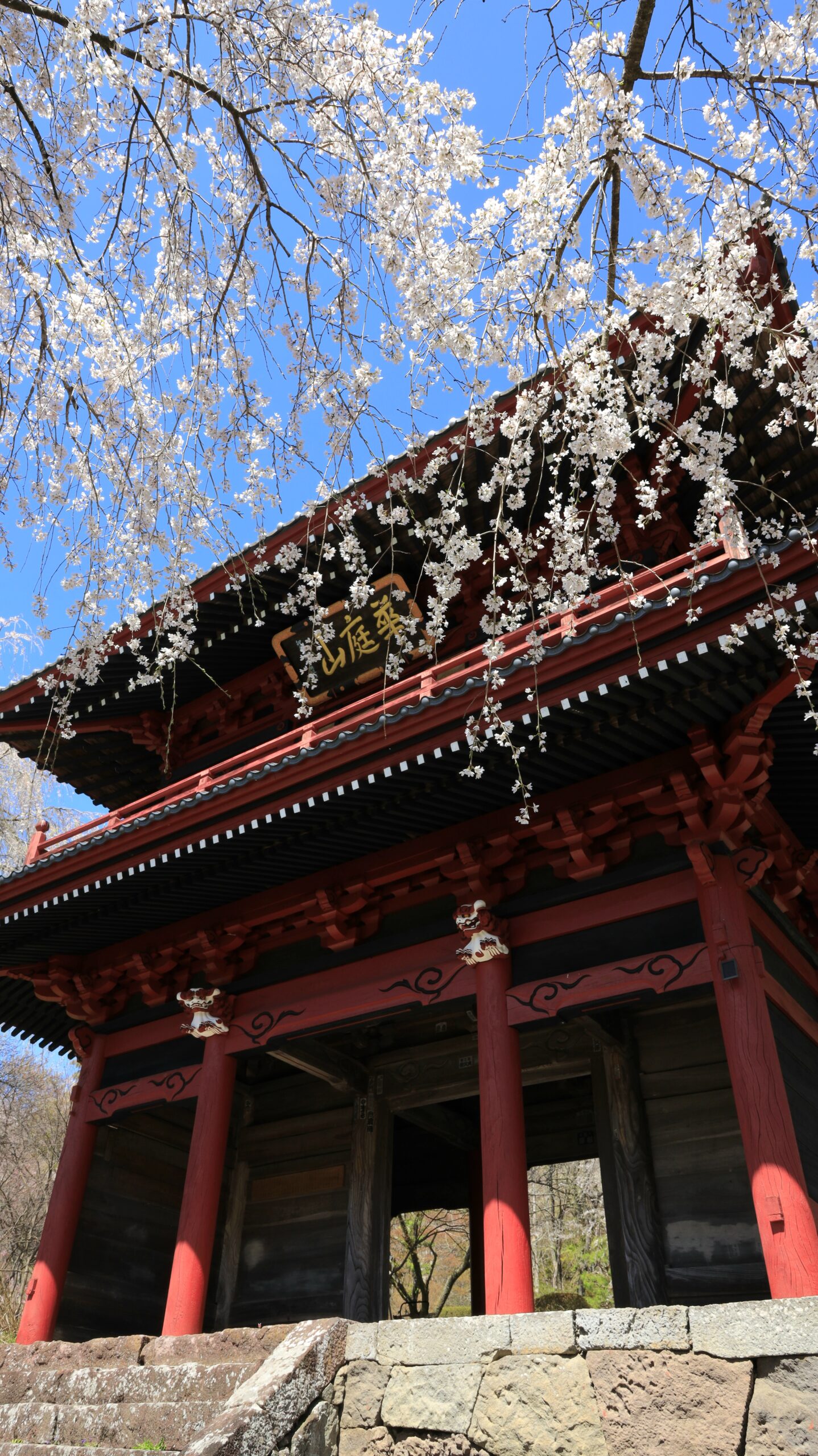This photo was taken at Daiunji Temple to capture the power of the gate, which is covered with weeping cherry trees.