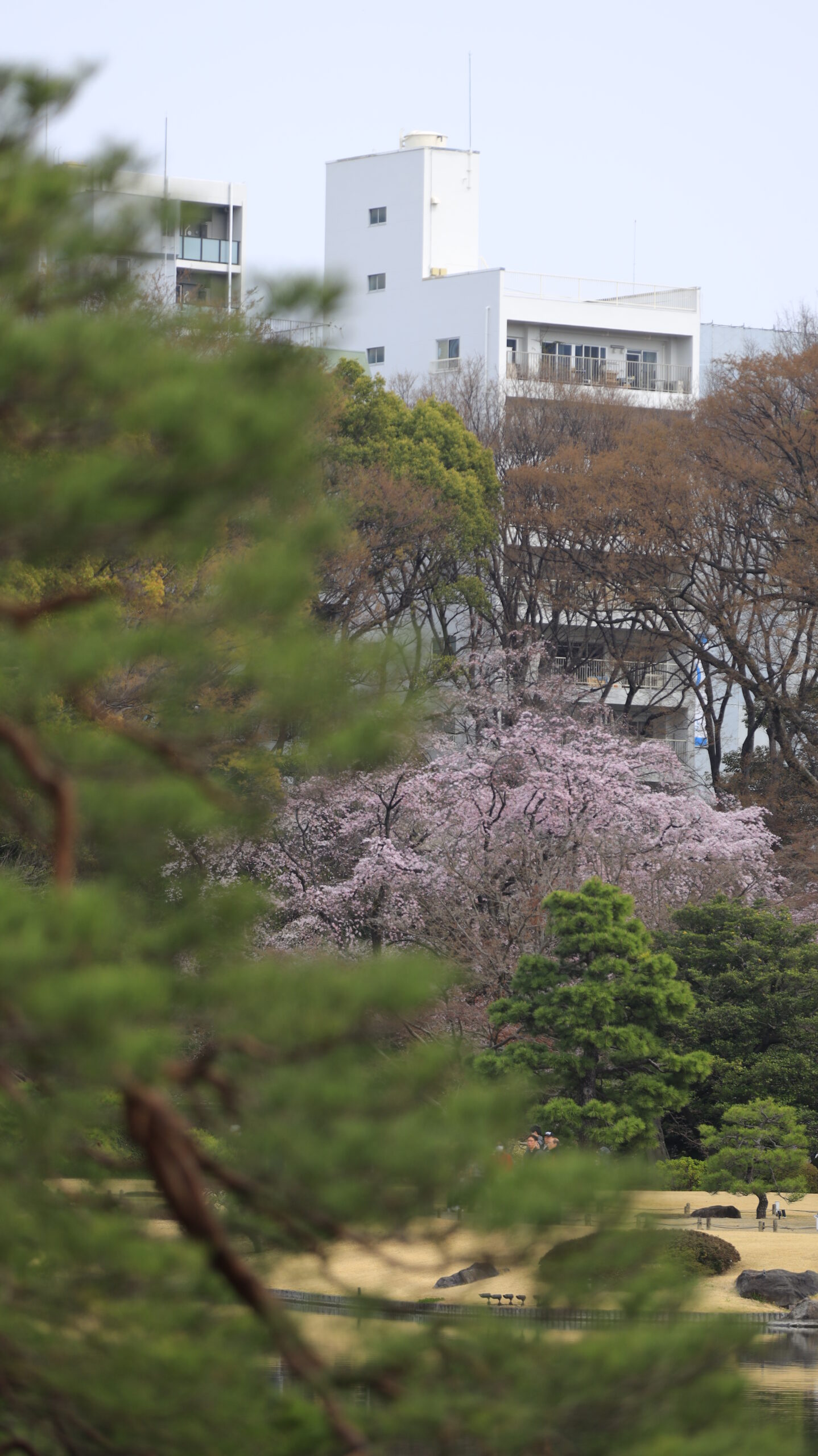This photograph of Rikugien Garden emphasizes perspective by blurring the pine tree in the foreground and capturing the weeping cherry tree in the distance.