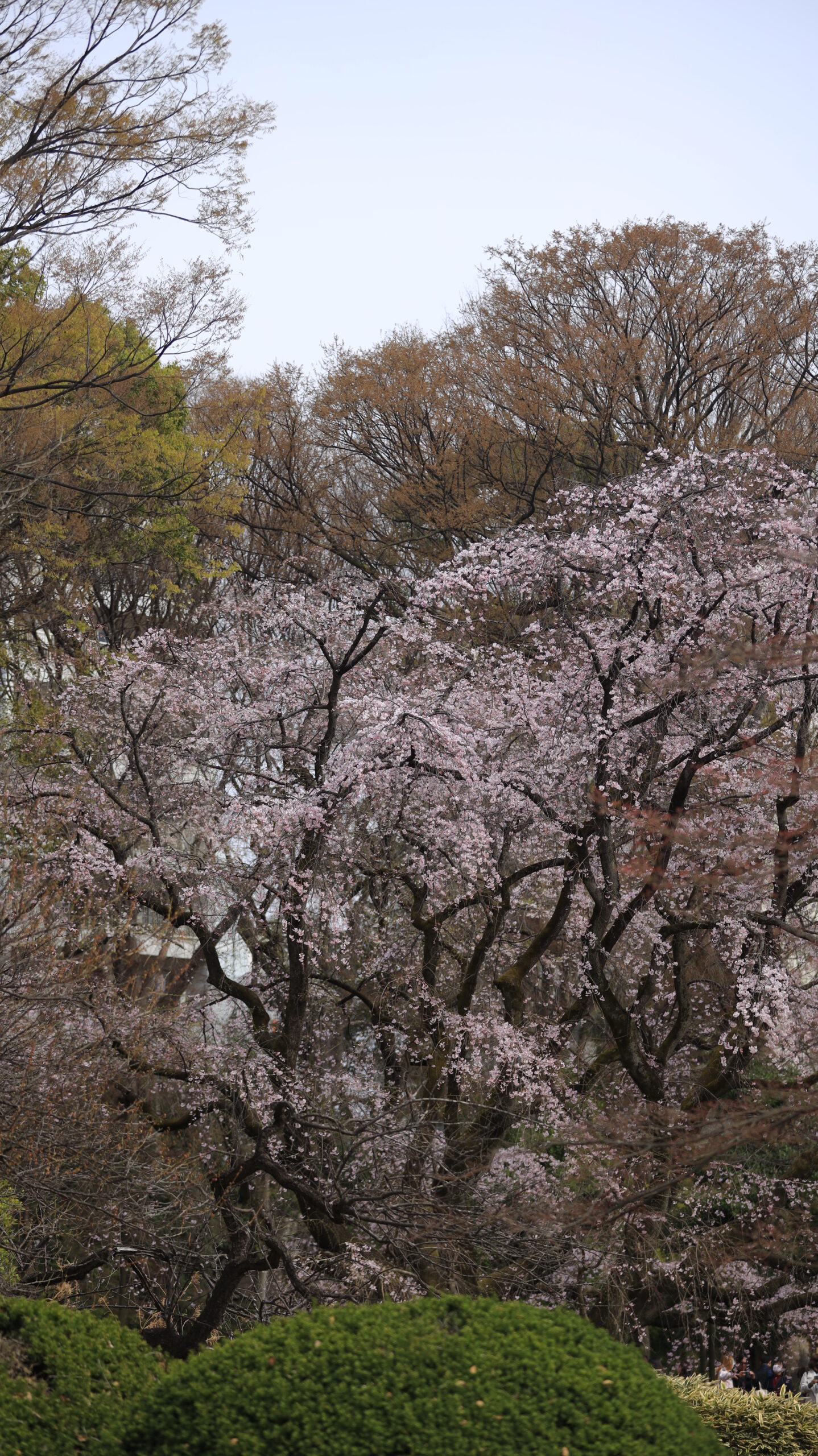 This photograph was taken at Rikugien Garden during low-light hours to capture the sky-high weeping cherry blossoms, which express tranquility and solemnity.