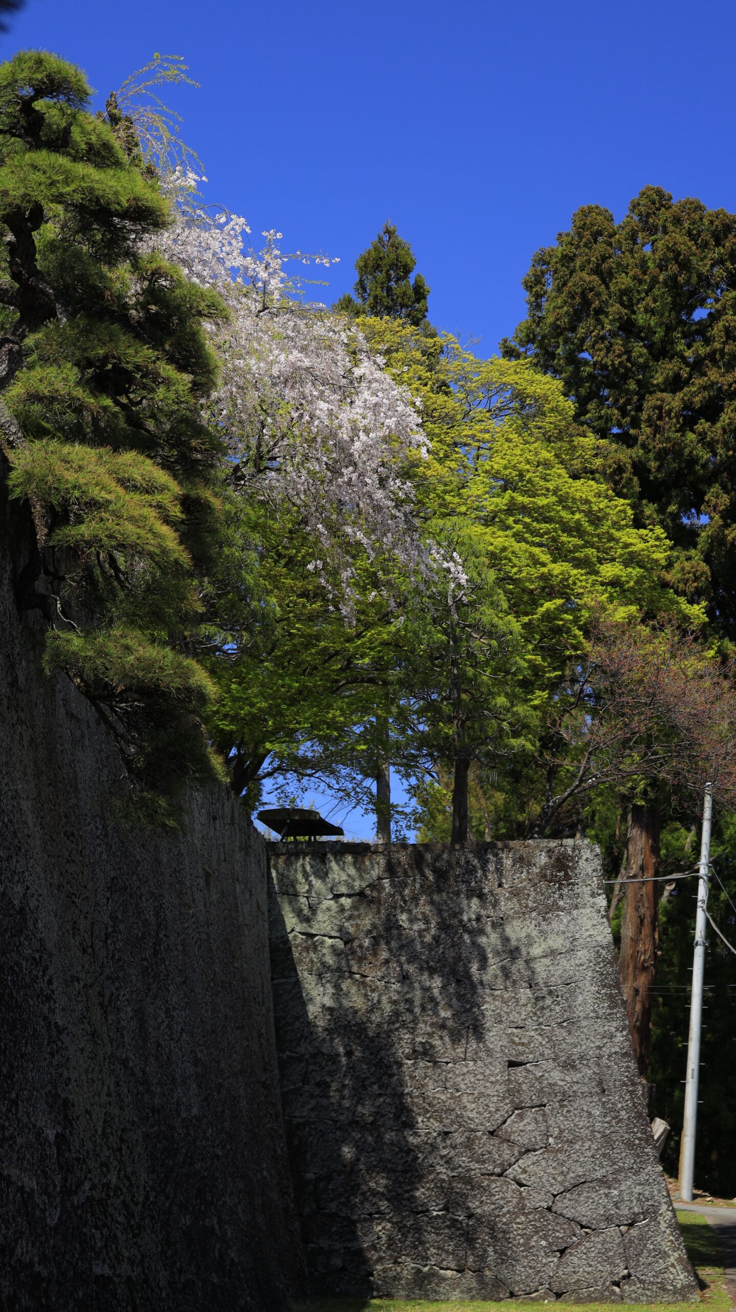 This photo was taken at Myogi Shrine by composing the photo by capturing the stone wall from the side and making the cherry tree above it the main subject.