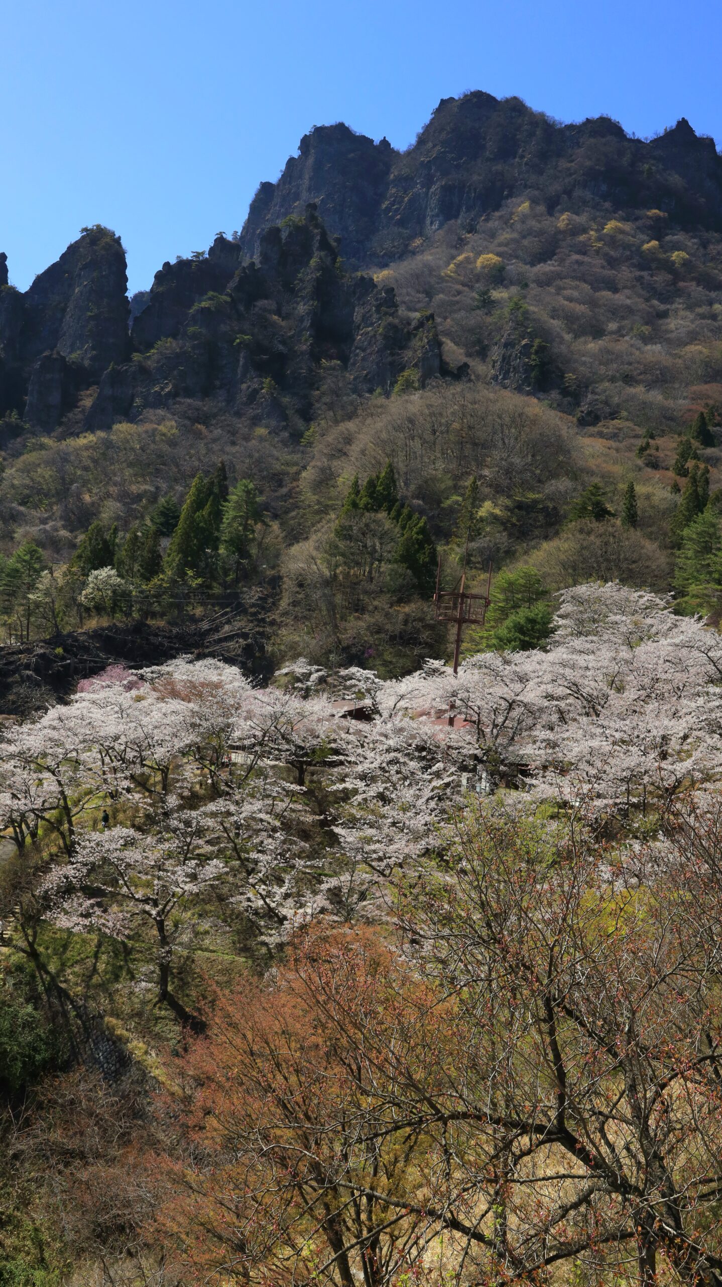 This photo was taken at the Myogisan Sakura no Sato, balancing the view of Mt. Myogi and the cherry blossoms at its foot from a high vantage point.