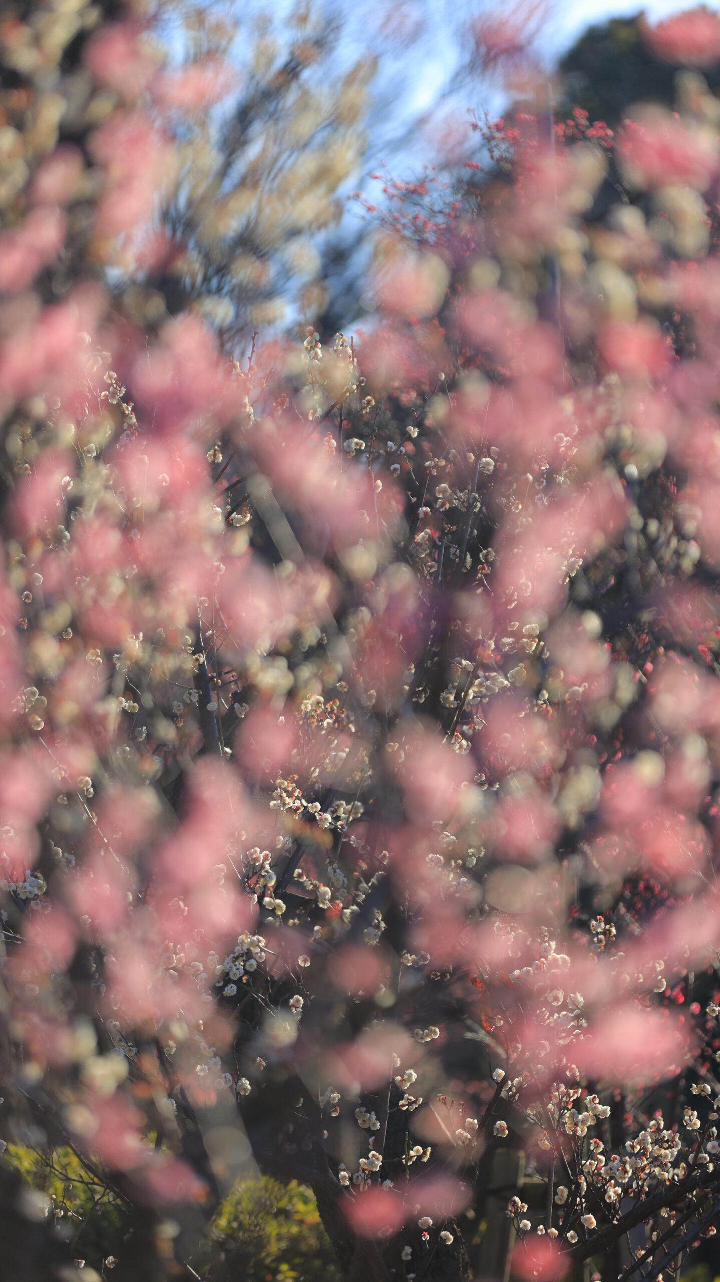 この写真は、羽根木公園で、ピンクの梅の花を全面的にぼかし、その奥にある白い梅の木をわずかに写し込むことで、柔らかく幻想的な雰囲気を意識して撮影したものです。