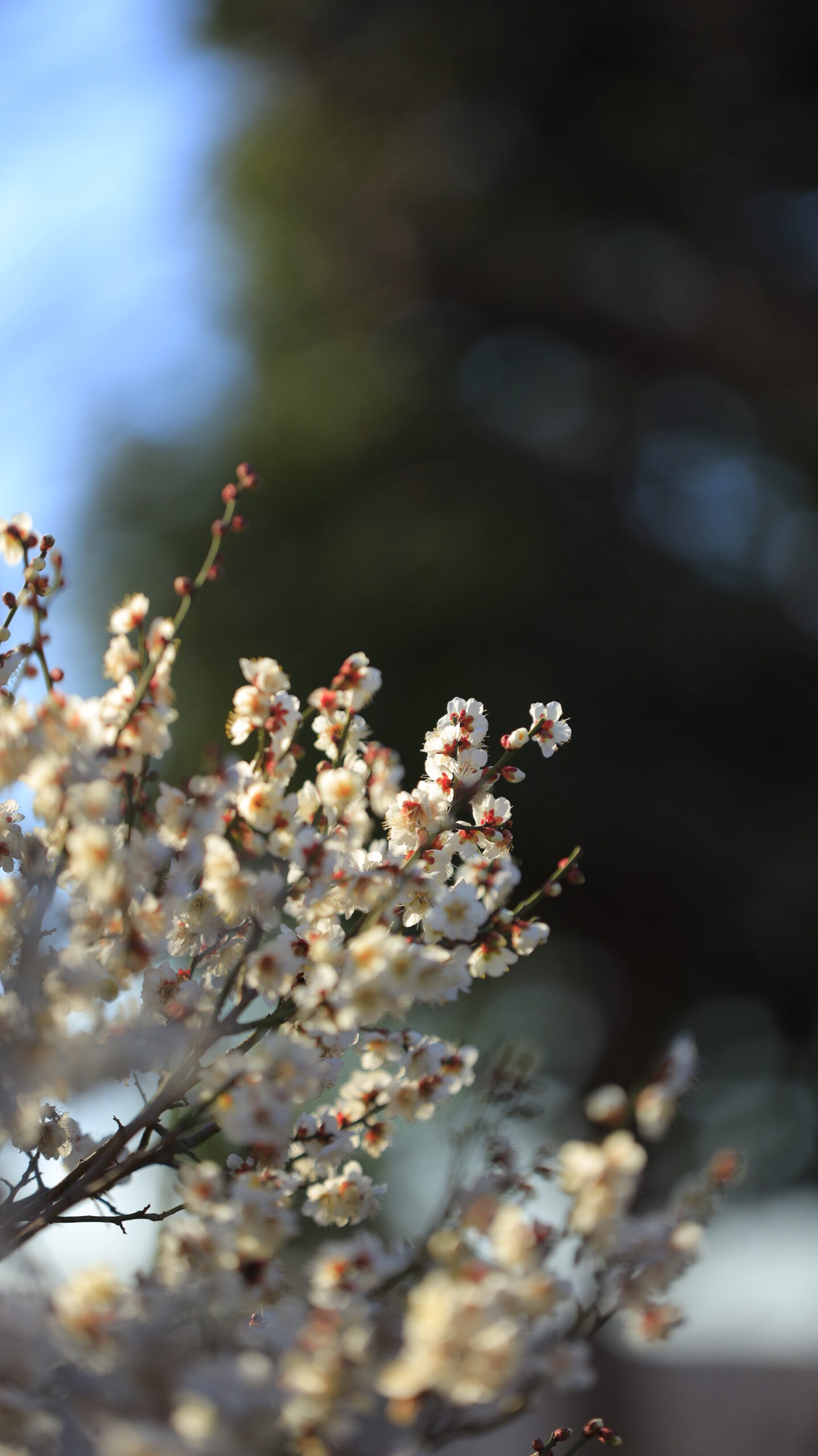 この写真は、羽根木公園で、後ろにある樹木を背景に、白い梅の花を際立たせるように撮影したものです。背景整理を意識した一枚です。