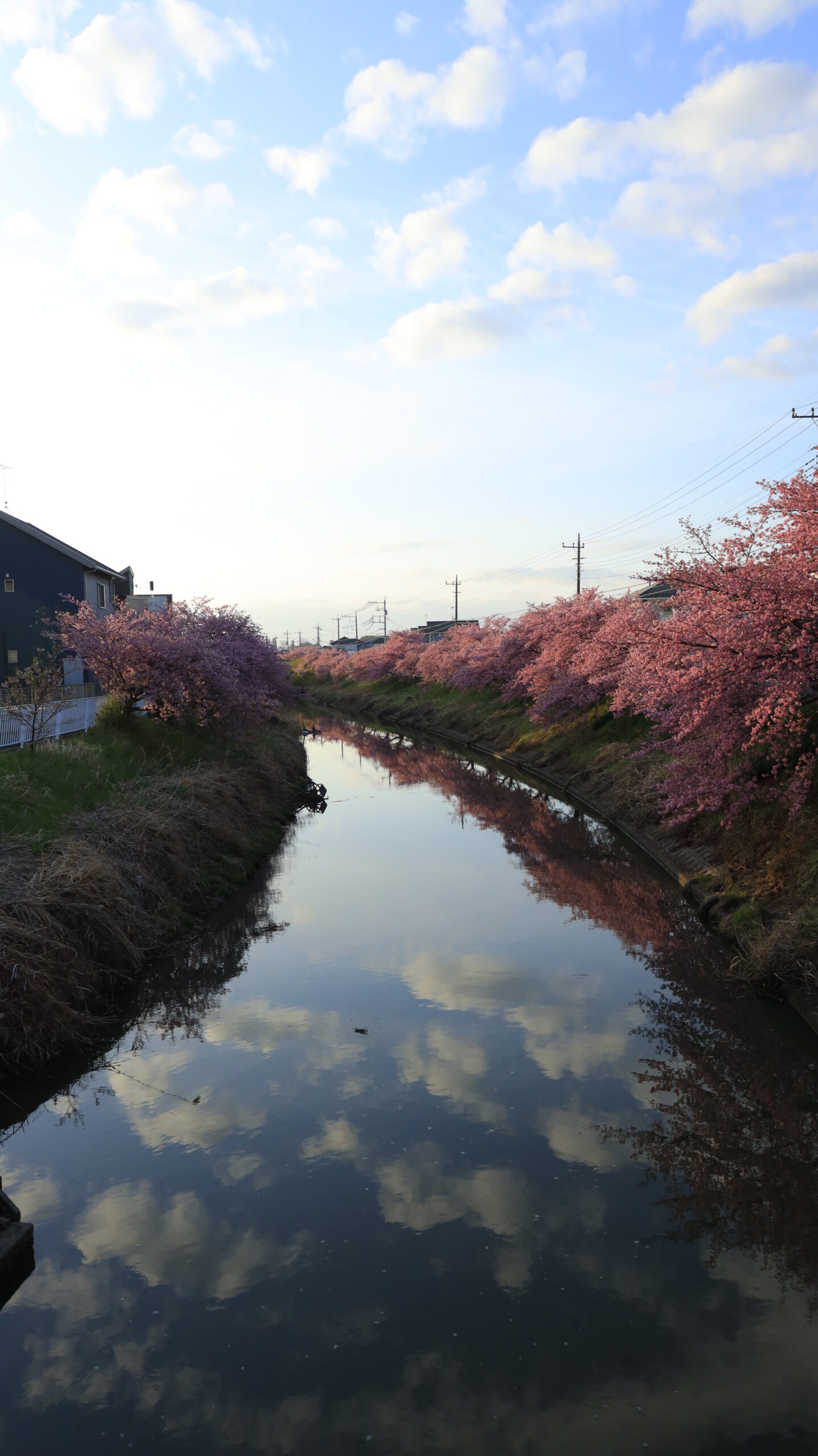 この写真は、青毛堀川で、川の水面に映り込む河津桜並木のリフレクションを捉え、春の風景が水面に広がる様子を撮影したものです。