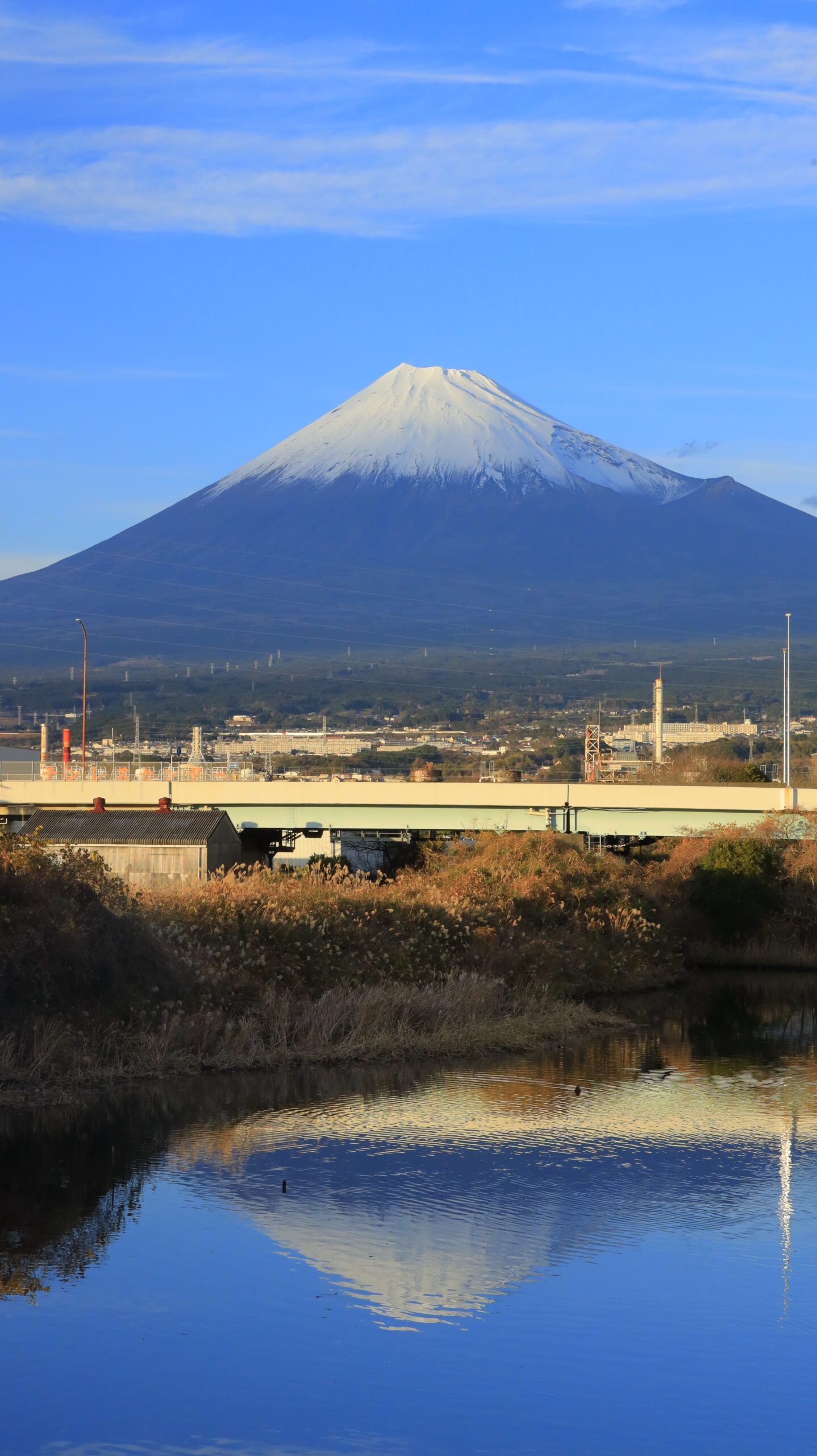 この写真は、富士山周辺(静岡)で、水辺に映りこむ富士山のリフレクションを撮影したものです。水面の映り込みを主役にしています。