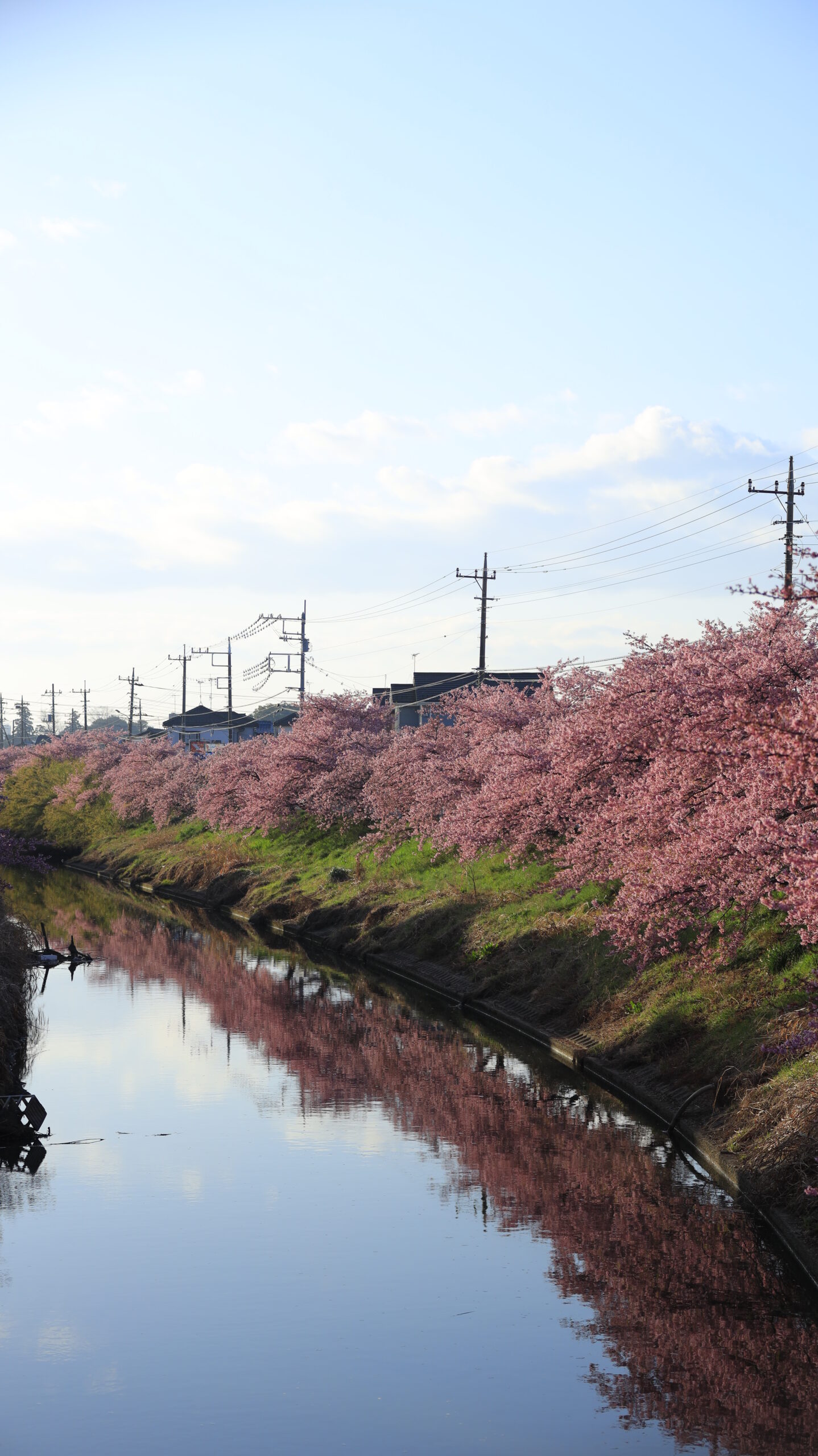 この写真は、青毛堀川で、土手沿いに続く河津桜が遠くまで見渡せるように奥行きを意識しながら撮影したものです。