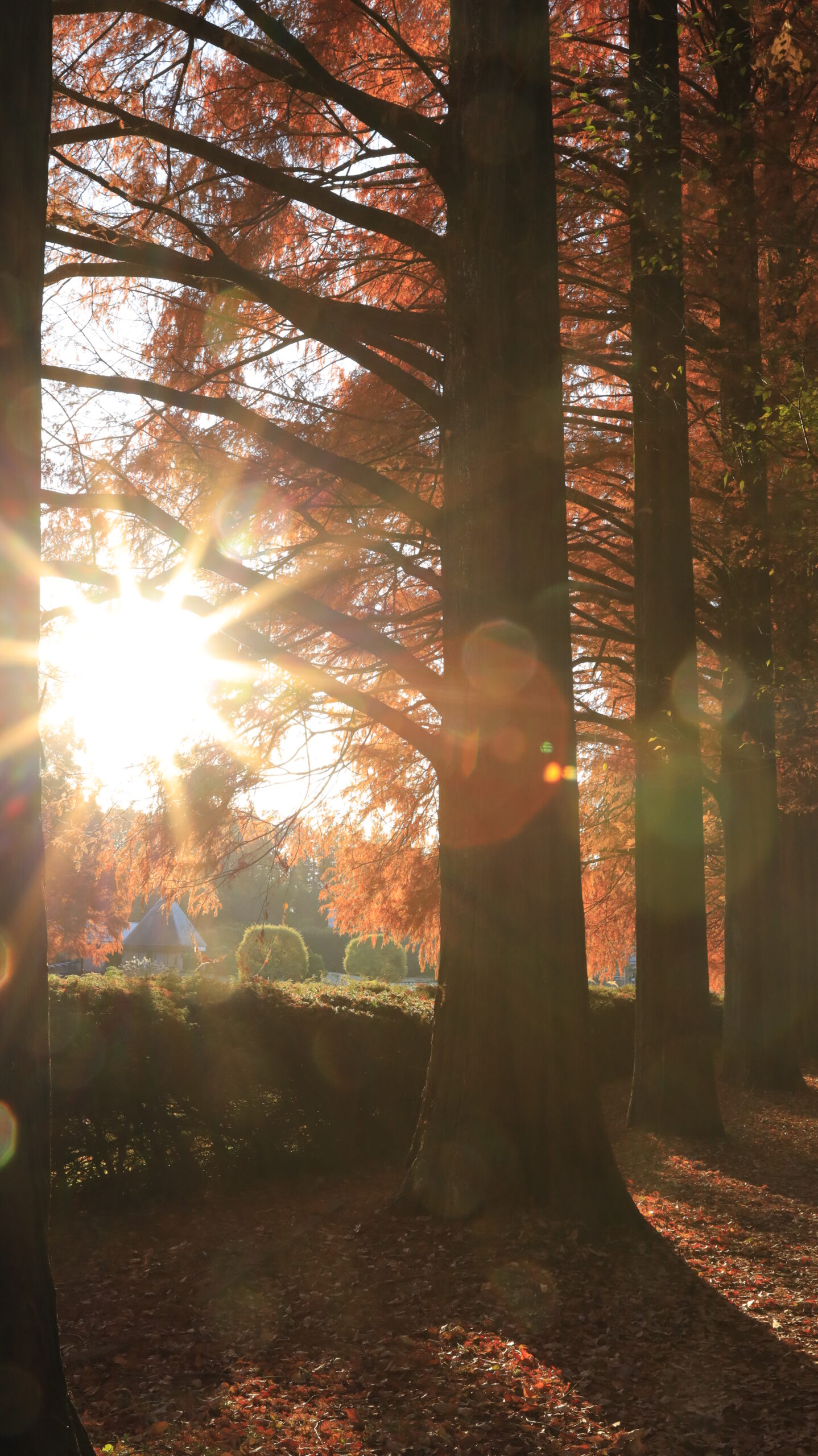 This photograph captures the moment when the intense morning sun shines through the leaves of the Metasequoia trees at Sagamihara Park, creating a striking backlit scene that conveys the energy of light.
