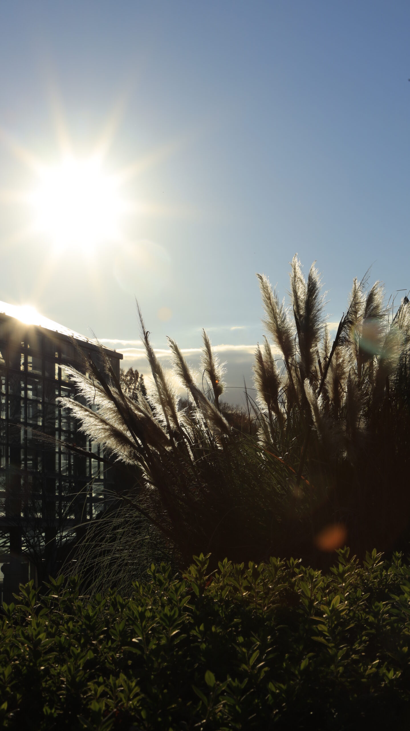 この写真は、相模原公園で、パンパグラスが朝日を浴びて輝く様子を撮影したもので、黄金色に光る穂が美しく、朝の爽快感が伝わる一枚です。