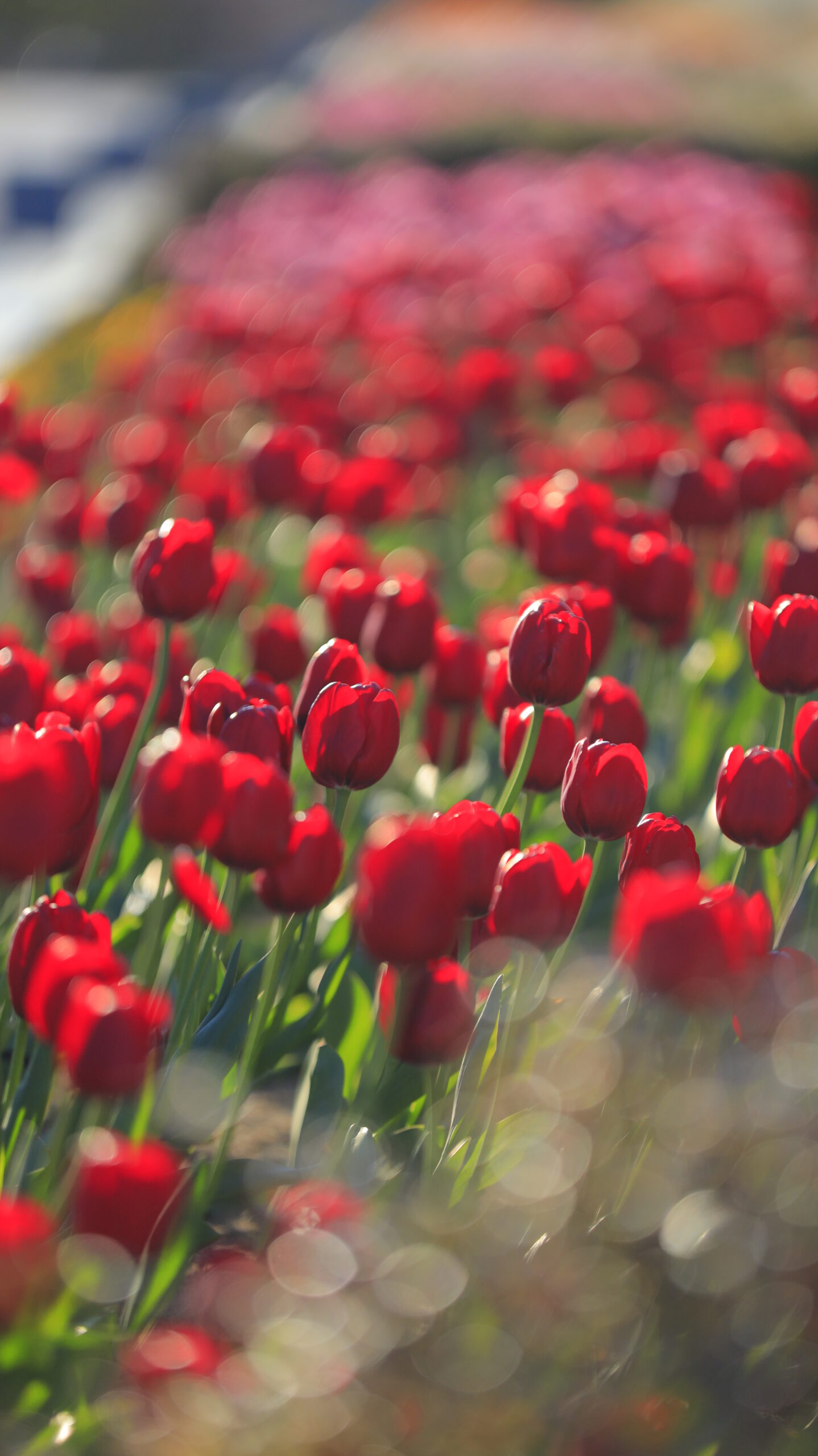 この写真は、シンボルプロムナード公園(台場)で、手前の草に当たる光を玉ボケにし、その奥に咲くアイスチューリップを撮影したものです。