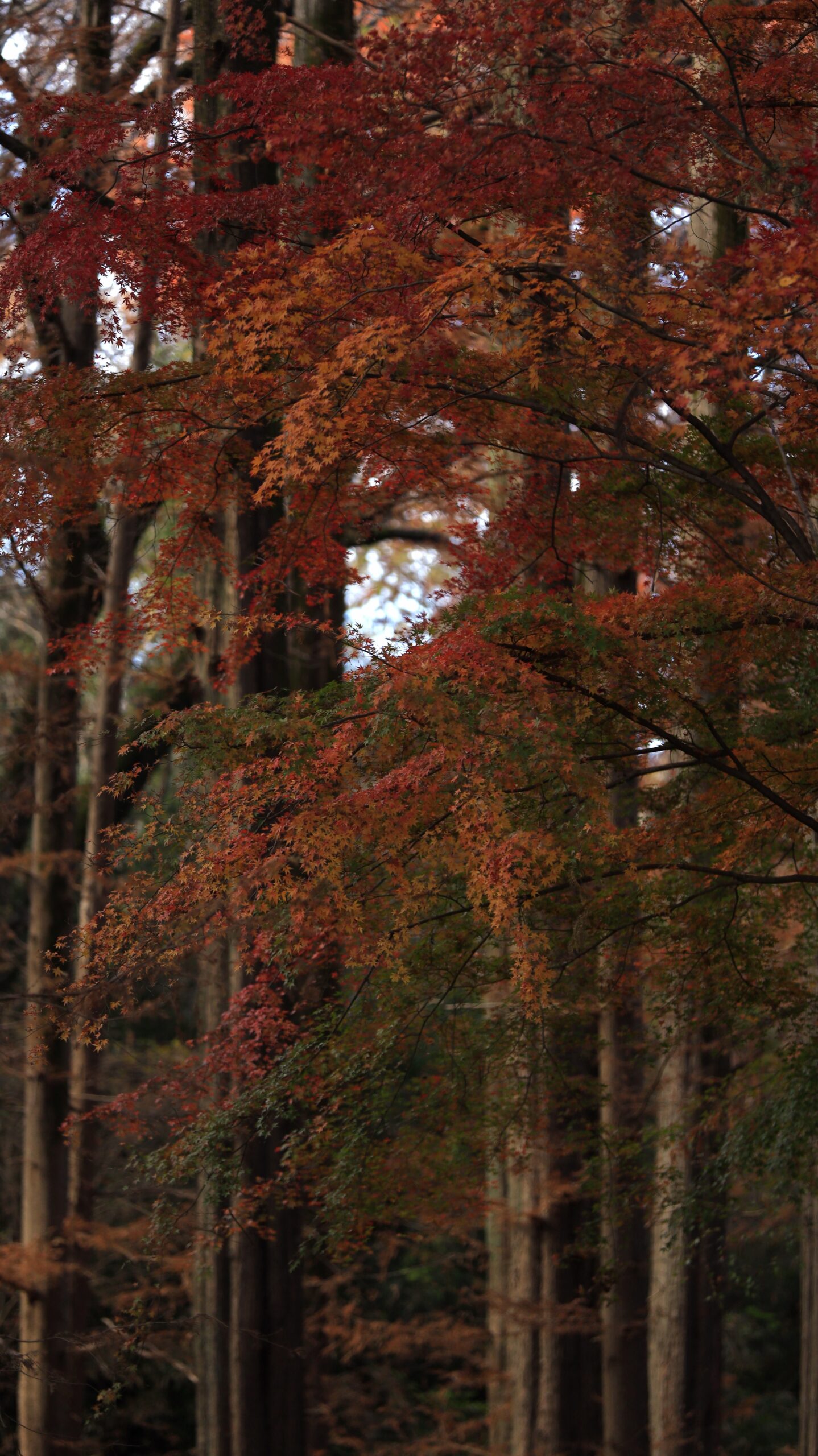この写真は、生田緑地で、薄暗い林の中に佇むモミジの寂しげな雰囲気を表現して撮影したもので、静けさの中にある侘びの美しさが伝わります。