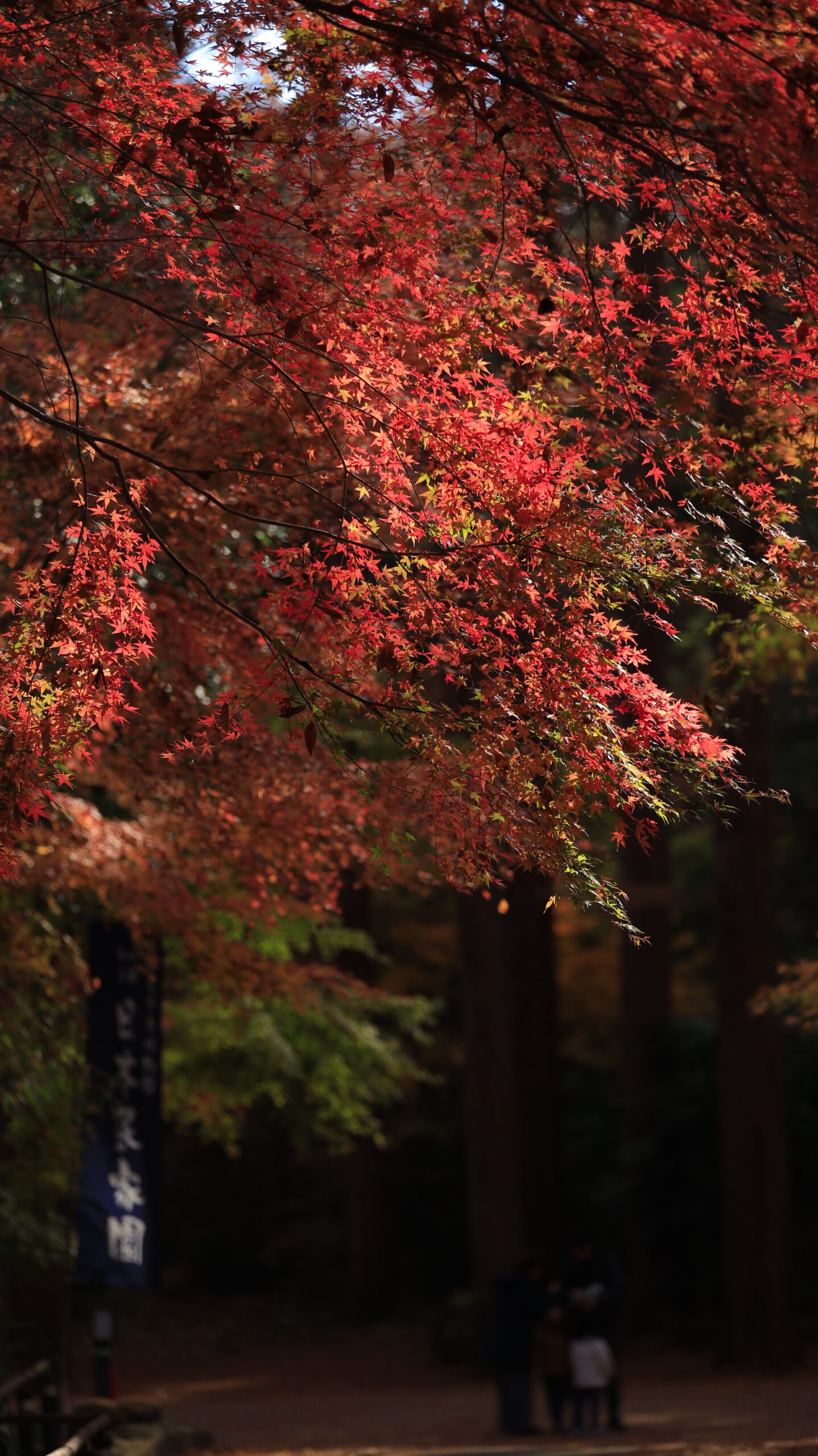 この写真は、生田緑地で、暗い林の中でも光が差し込む位置を探し、そこに輝くモミジを撮影したもので、光のドラマを切り取ったような一枚です。