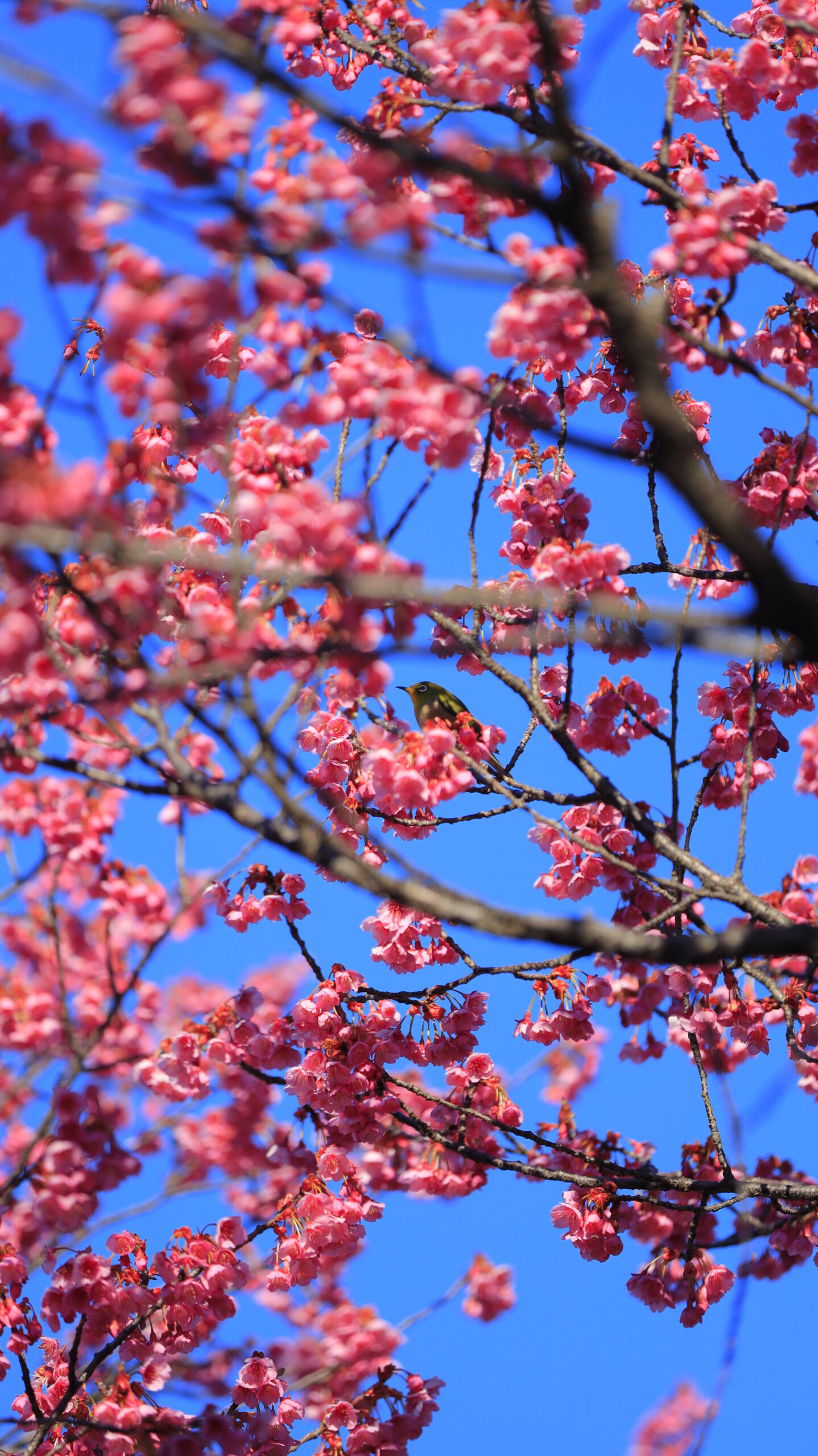 荏原神社で寒緋桜の奥にいるメジロを花の間から写した春の気配を感じる一枚