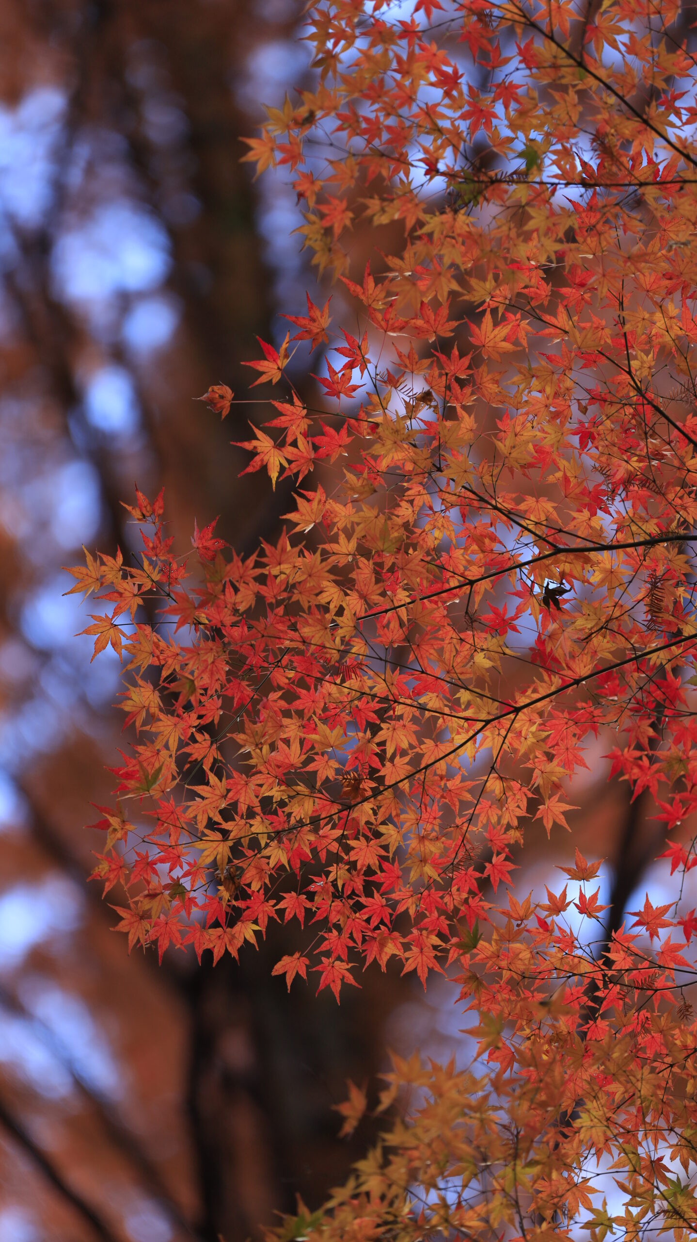 この写真は、生田緑地で、横方向から見た、オレンジと赤のグラデーションが美しいモミジを撮影したもので、色の移ろいを繊細に表現した作品です。