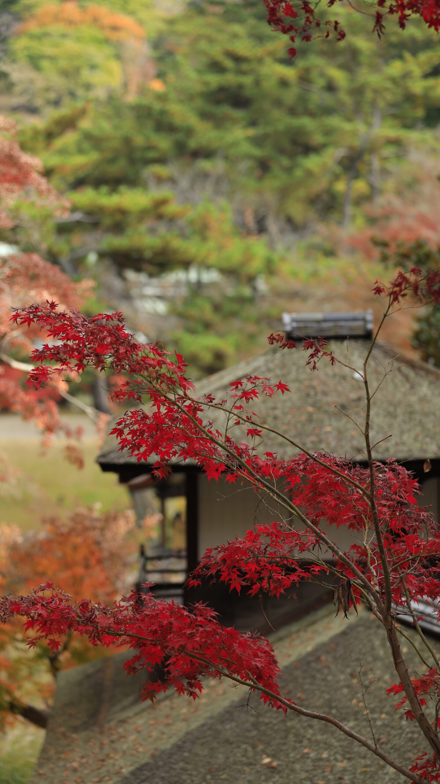 この写真は、三渓園で、古い建築物と美しいモミジの彩りを一緒に撮影したもので、日本庭園らしい伝統美の広がりが感じられます。
