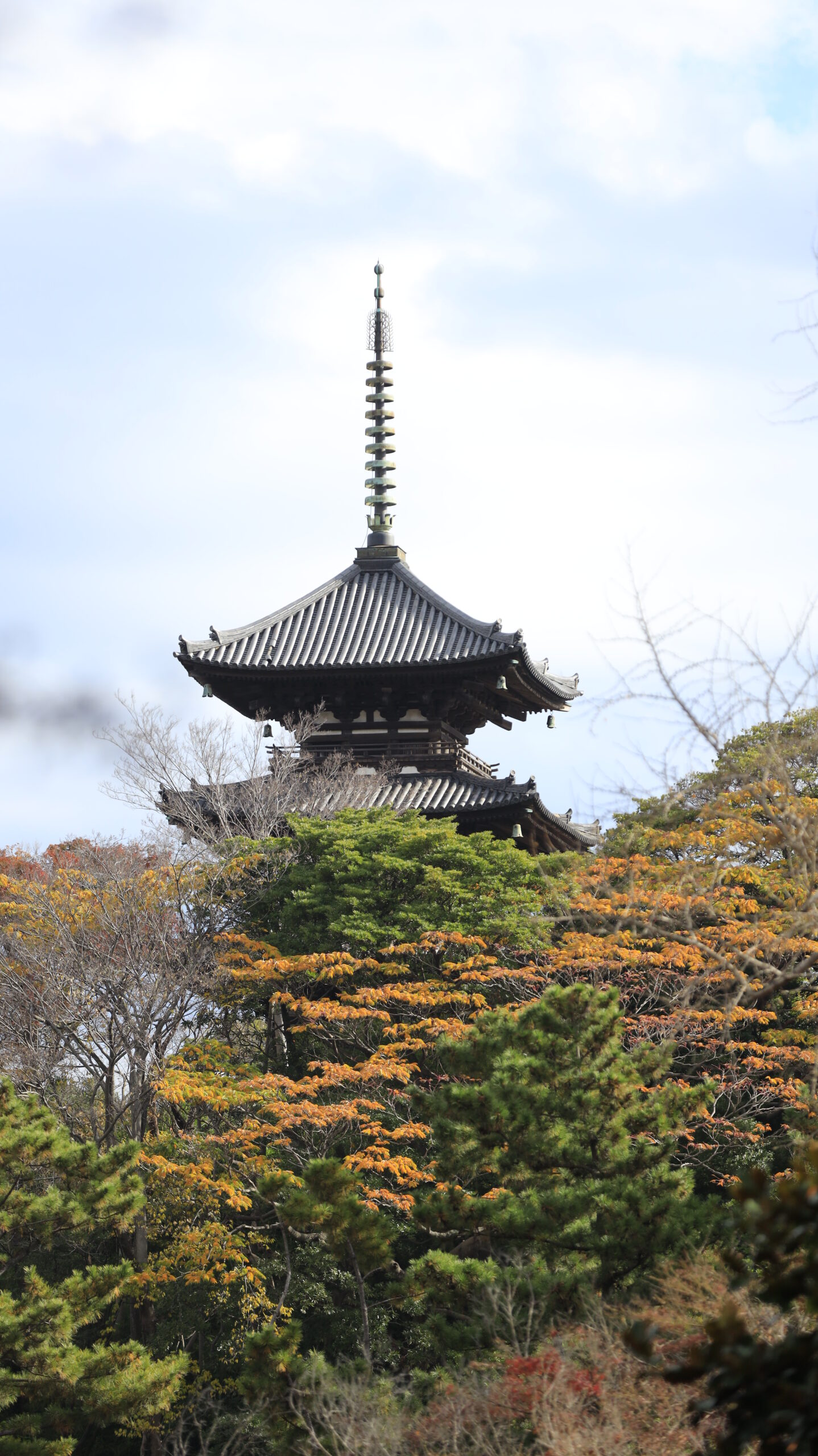 この写真は、三渓園で、オレンジ色の紅葉と遠くに見える三重塔を組み合わせて撮影したもので、景観の奥行きが強く伝わる秋の一枚です。
