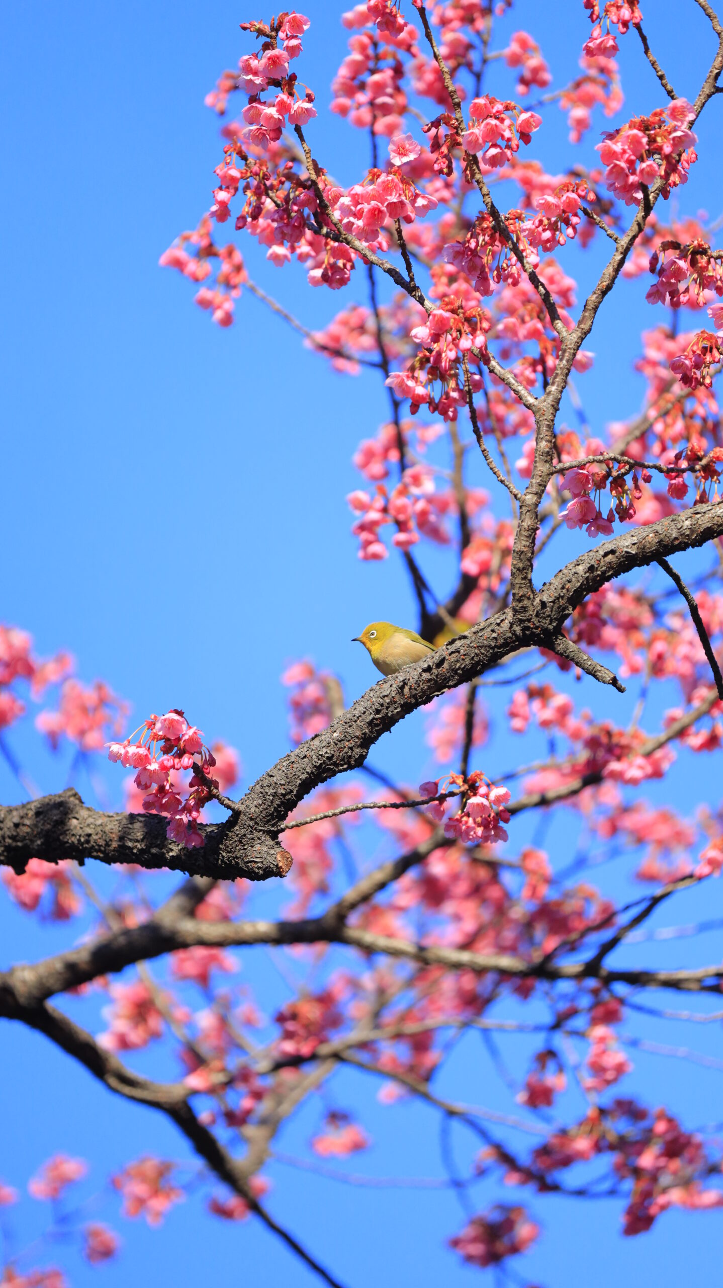 この写真は、荏原神社で、寒緋桜の枝にとまり、遠くを見つめるメジロの様子を撮影したものです。静かな時間が流れています。