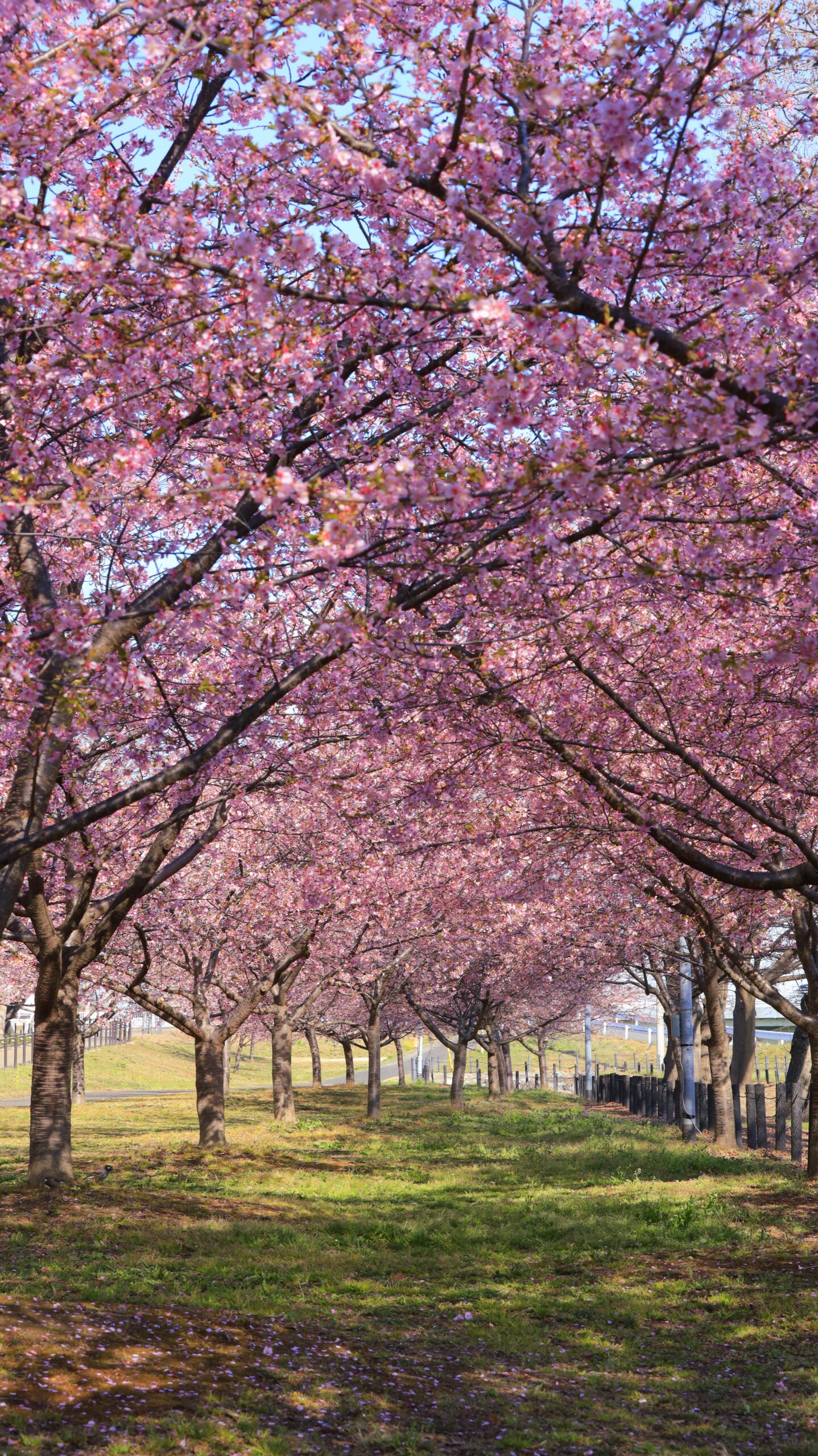この写真は、幸手権現堂で、河津桜のトンネルを下から低い位置で構え、明るいトーンで春の雰囲気を強調して撮影したものです。