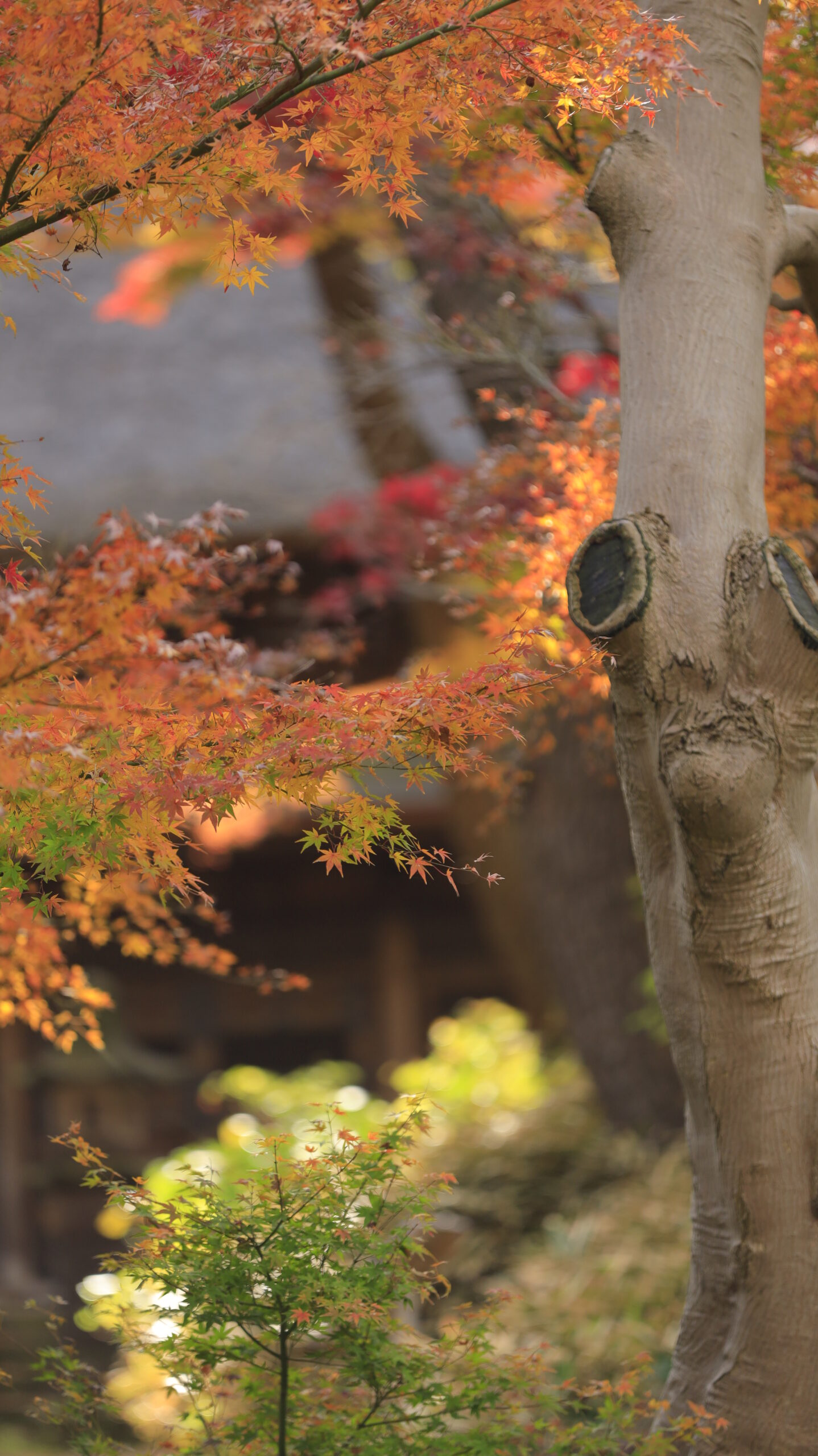 この写真は、三渓園で、オレンジの綺麗なモミジに光が当たる瞬間を撮影したもので、柔らかな光が葉を透かし、秋らしい温もりを感じる一枚です。