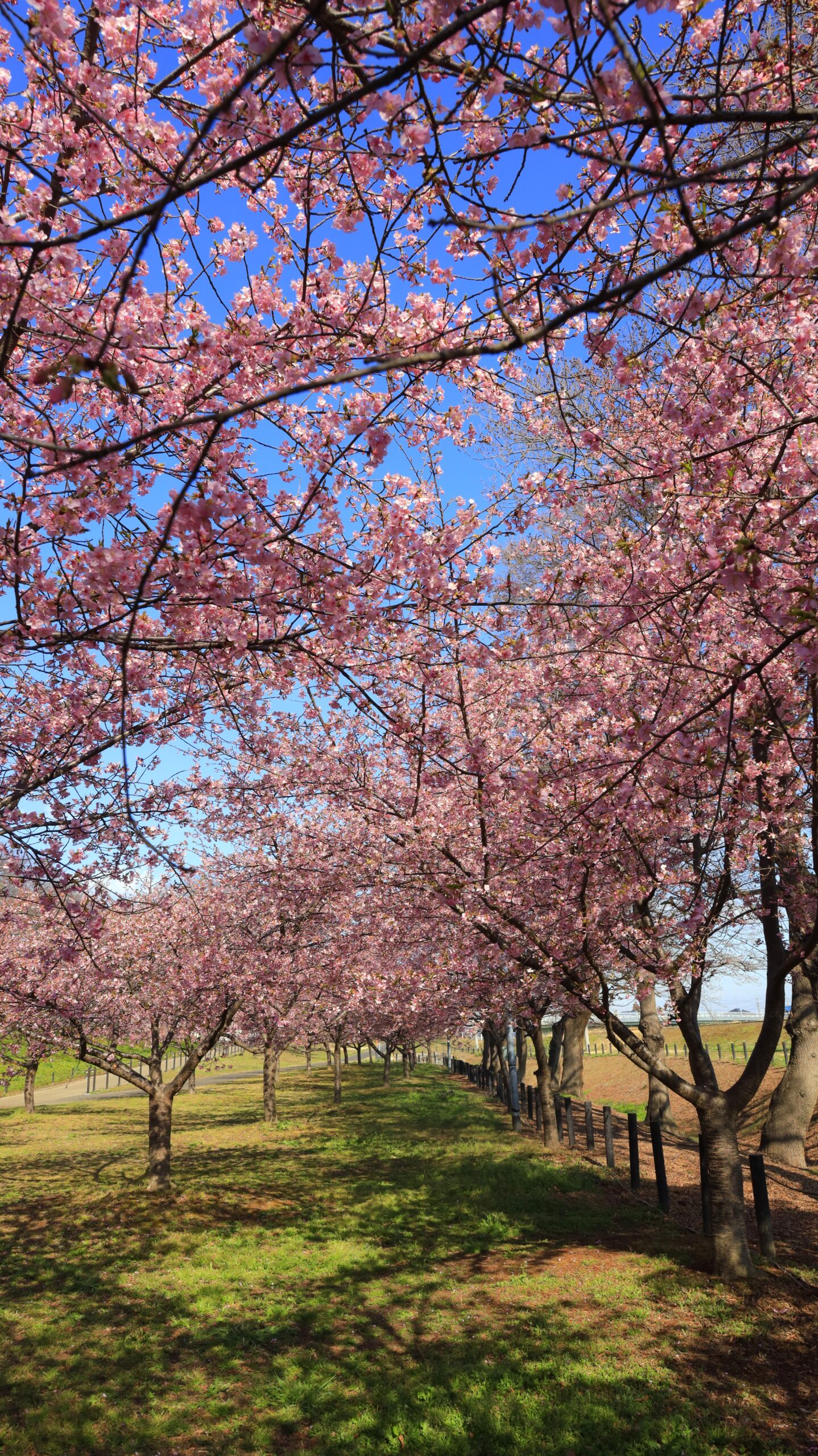 幸手権現堂の奥まで続く河津桜並木の春の風景