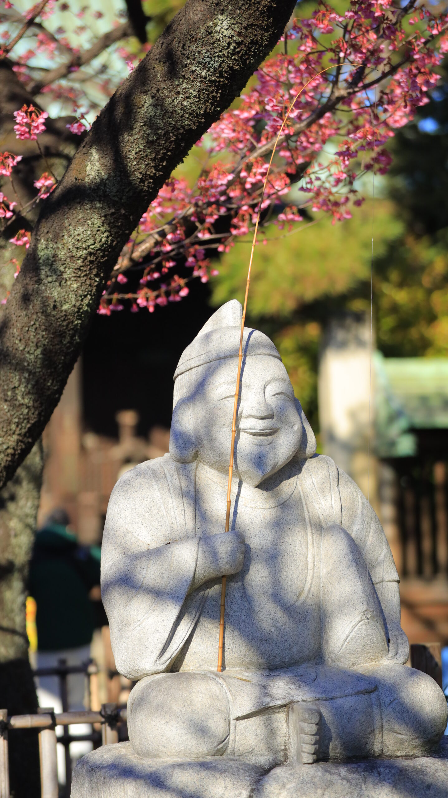 この写真は、荏原神社で、寒緋桜の木の下に佇むえびす様を撮影したものです。神社らしい穏やかな空気感を表現しました。