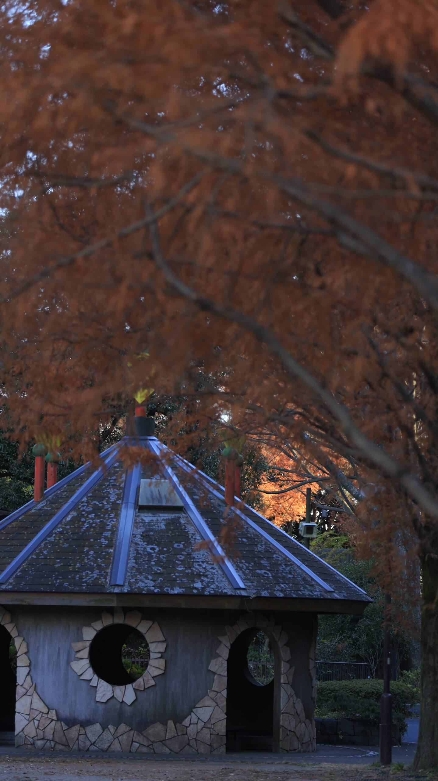 この写真は、金沢動物園で、メタセコイアと小屋の様子を陰になったタイミングで撮影したもので、落ち着いた光の表情が園内の静けさを引き立てています。