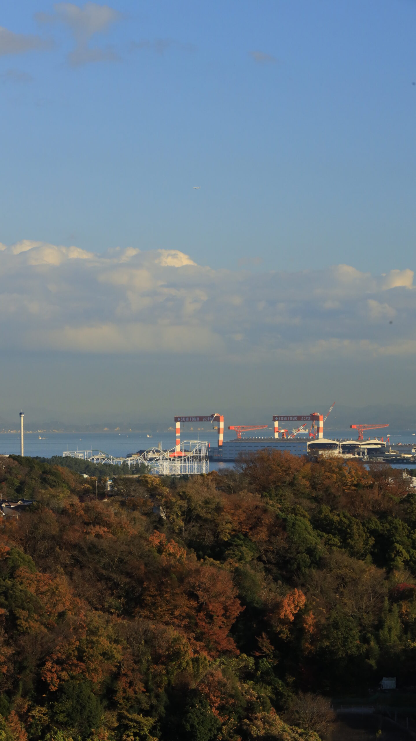金沢動物園の高台から山の紅葉、海、工場群を一望できる広大な眺望を捉えた写真。