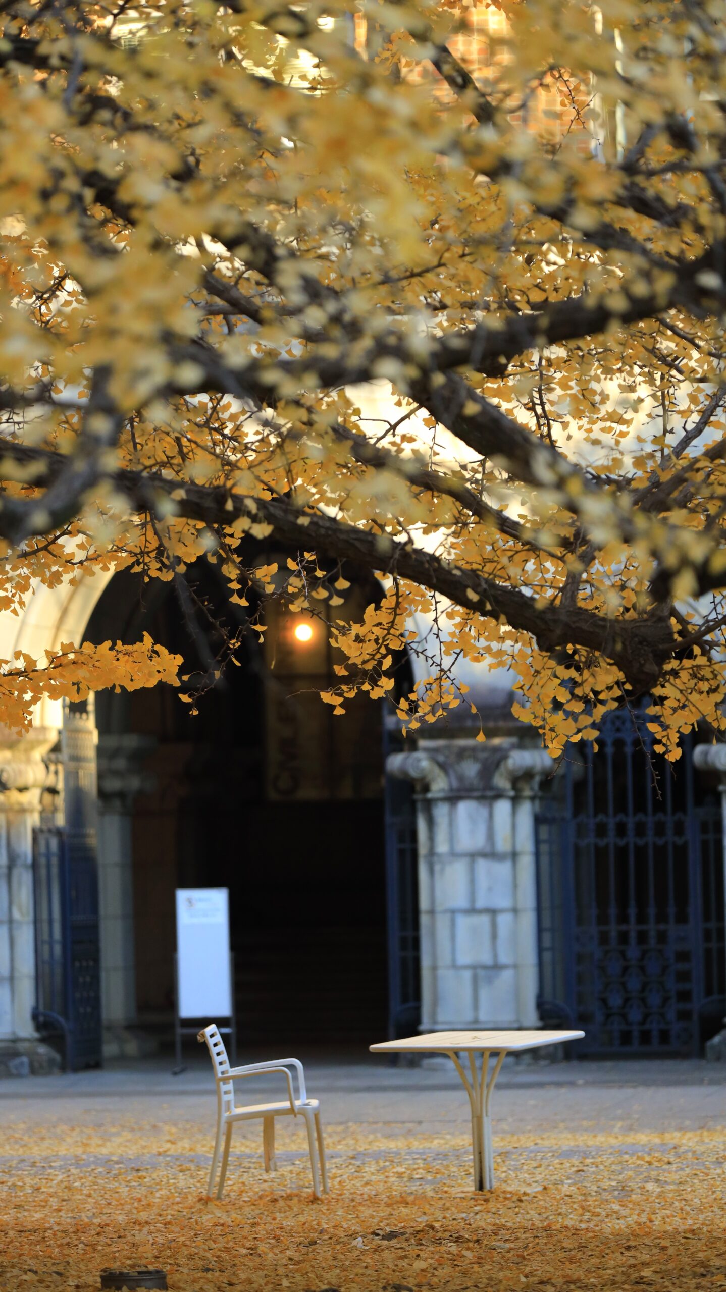 この写真は、東京大学本郷キャンパスで、大きな銀杏の木の下からテーブルや後ろの灯りを意識して撮影したもので、静かなキャンパスの夜の雰囲気が柔らかく表現されています。