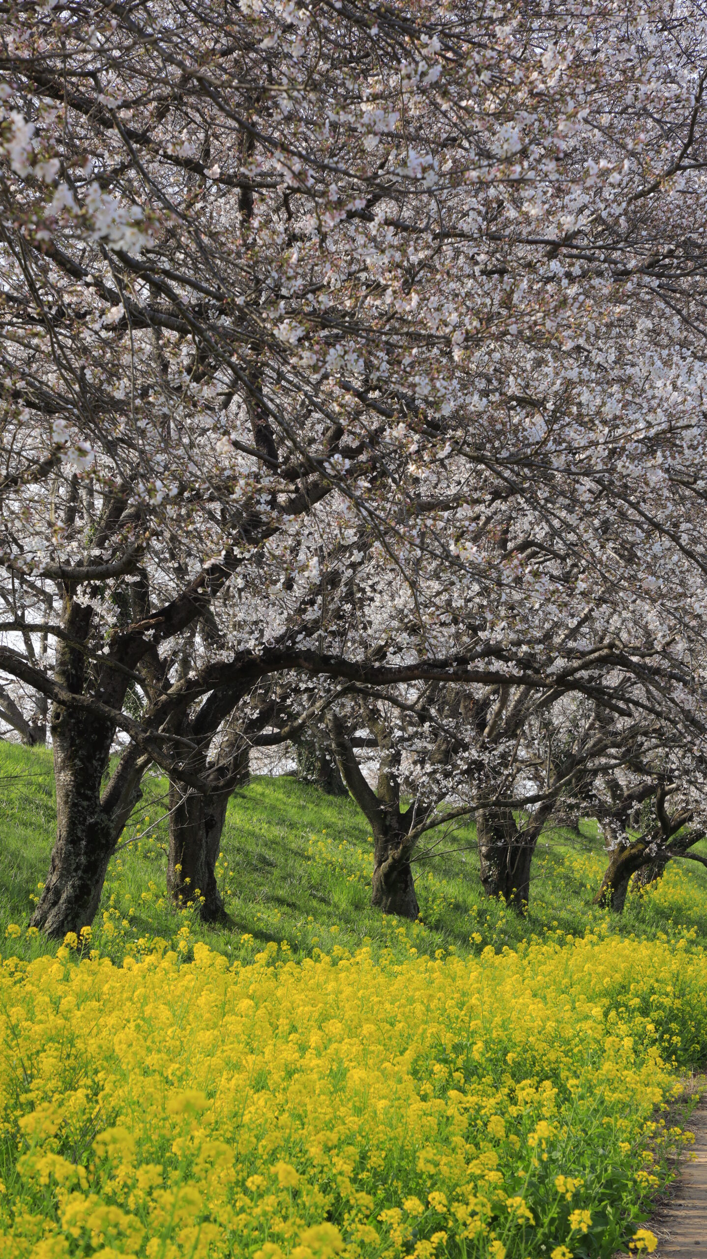 This photo was taken at Sakura Tsutsumi Park from an angle that allows a slightly deeper view of the rows of cherry trees and the rape blossoms below.