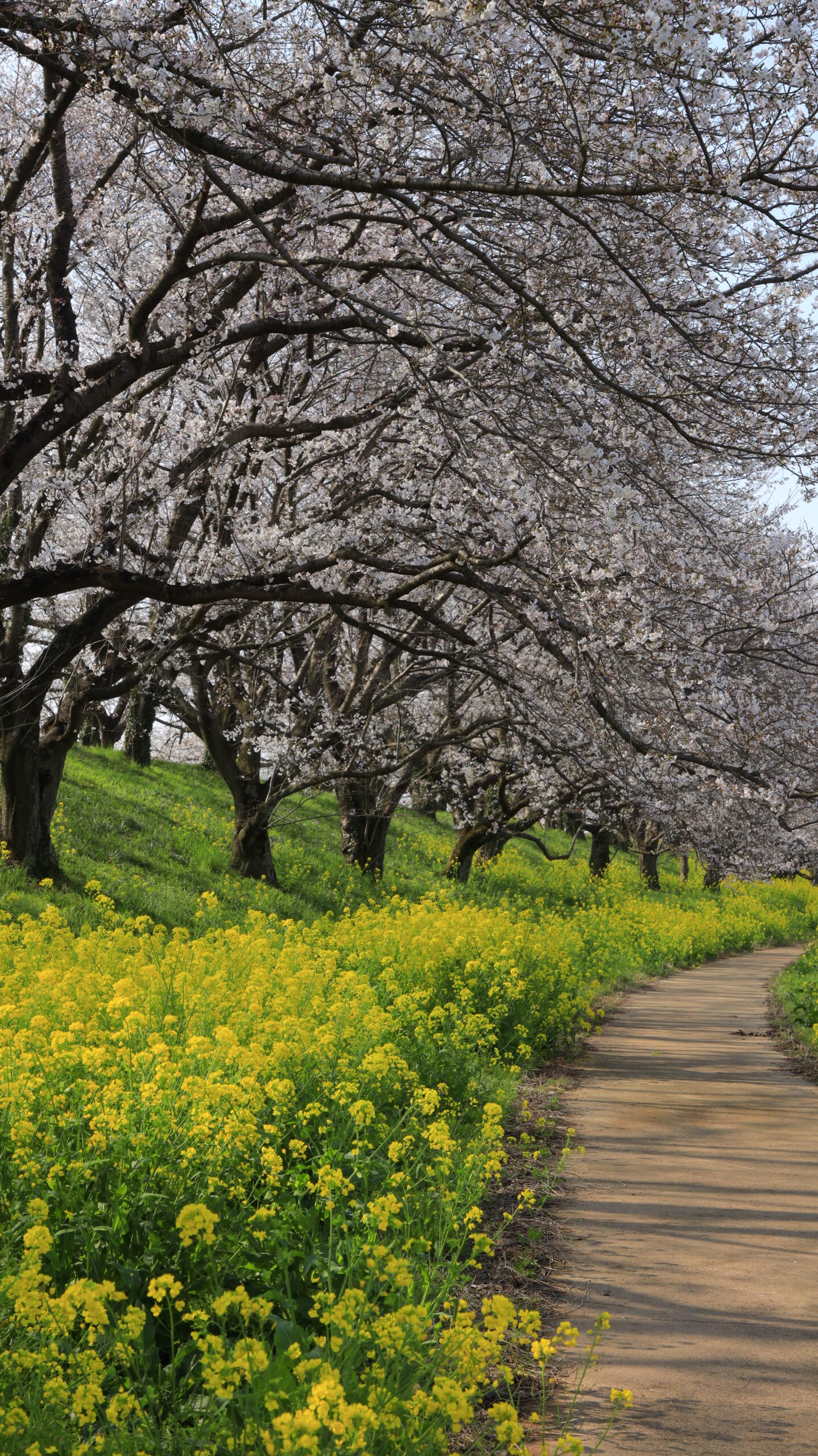 This photo was taken at Sakura Tsutsumi Park, at an angle and with the flow of cherry blossom trees and rape blossoms road in mind.